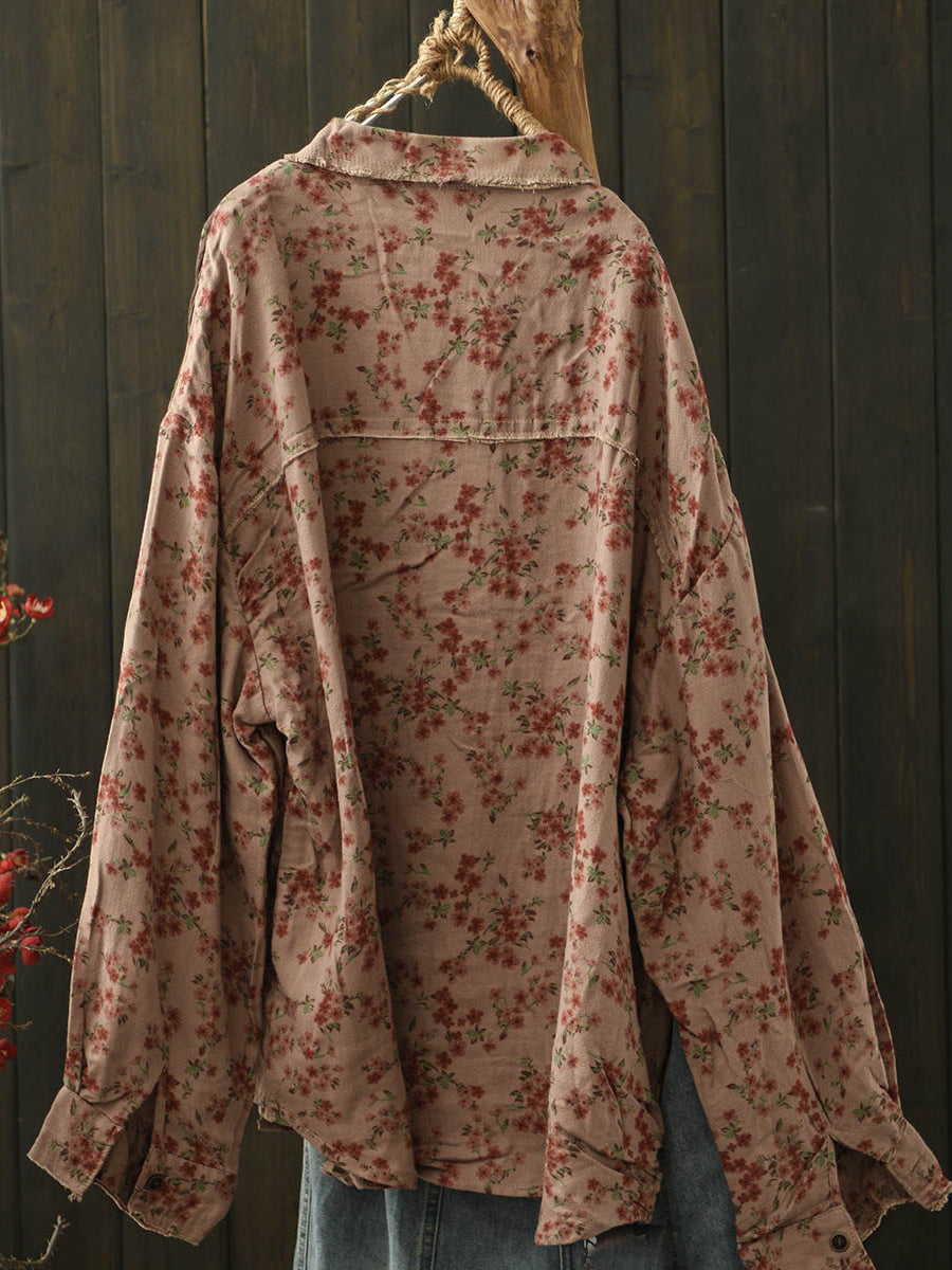 Women Spring Floral Spliced Turn-down Collar Cotton Blouse