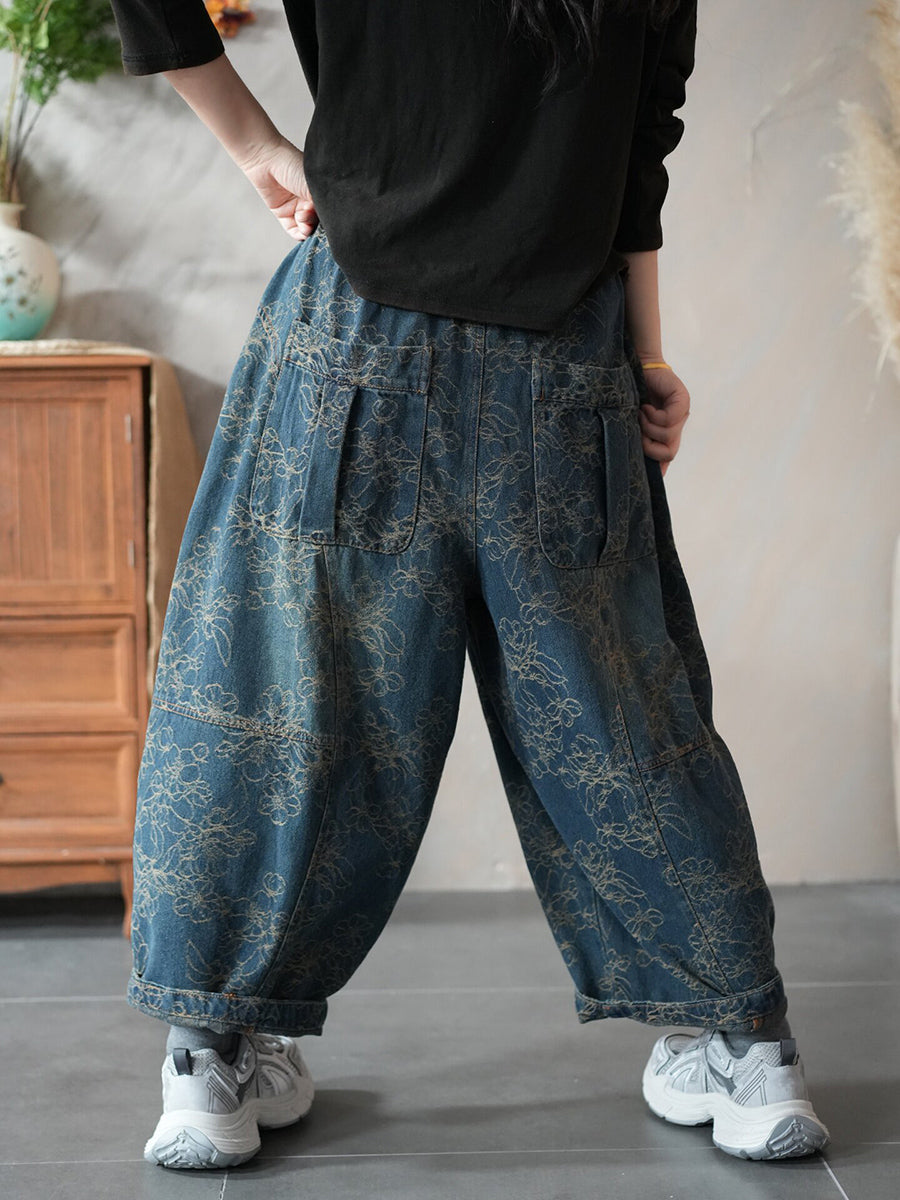 Women Spring Retro Denim Flower Harem Pants