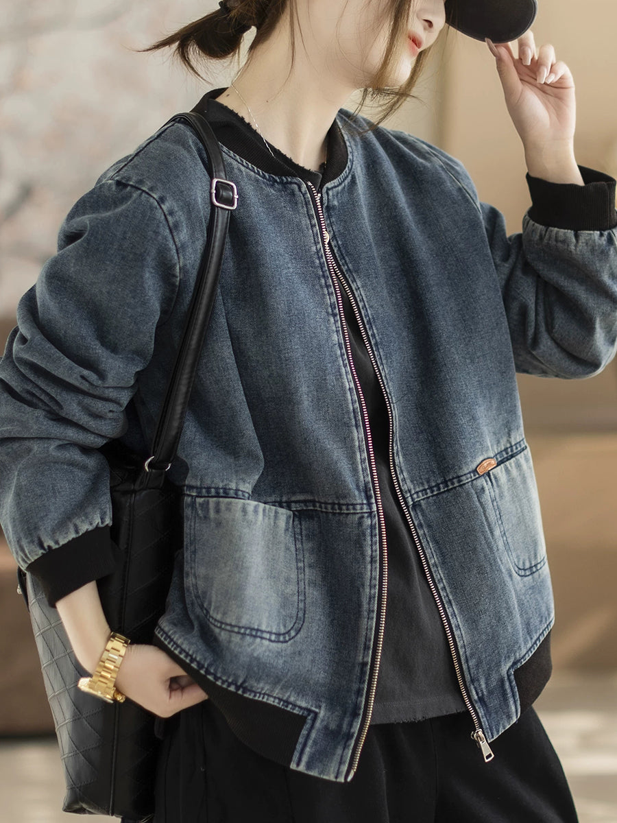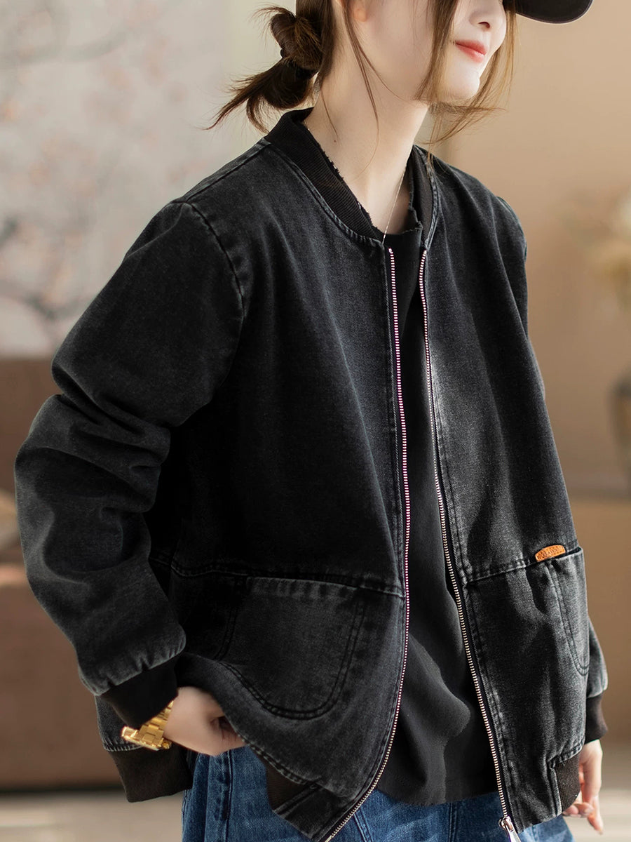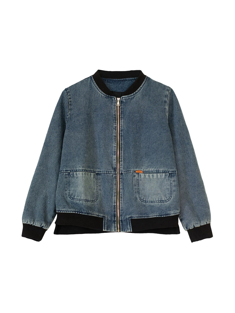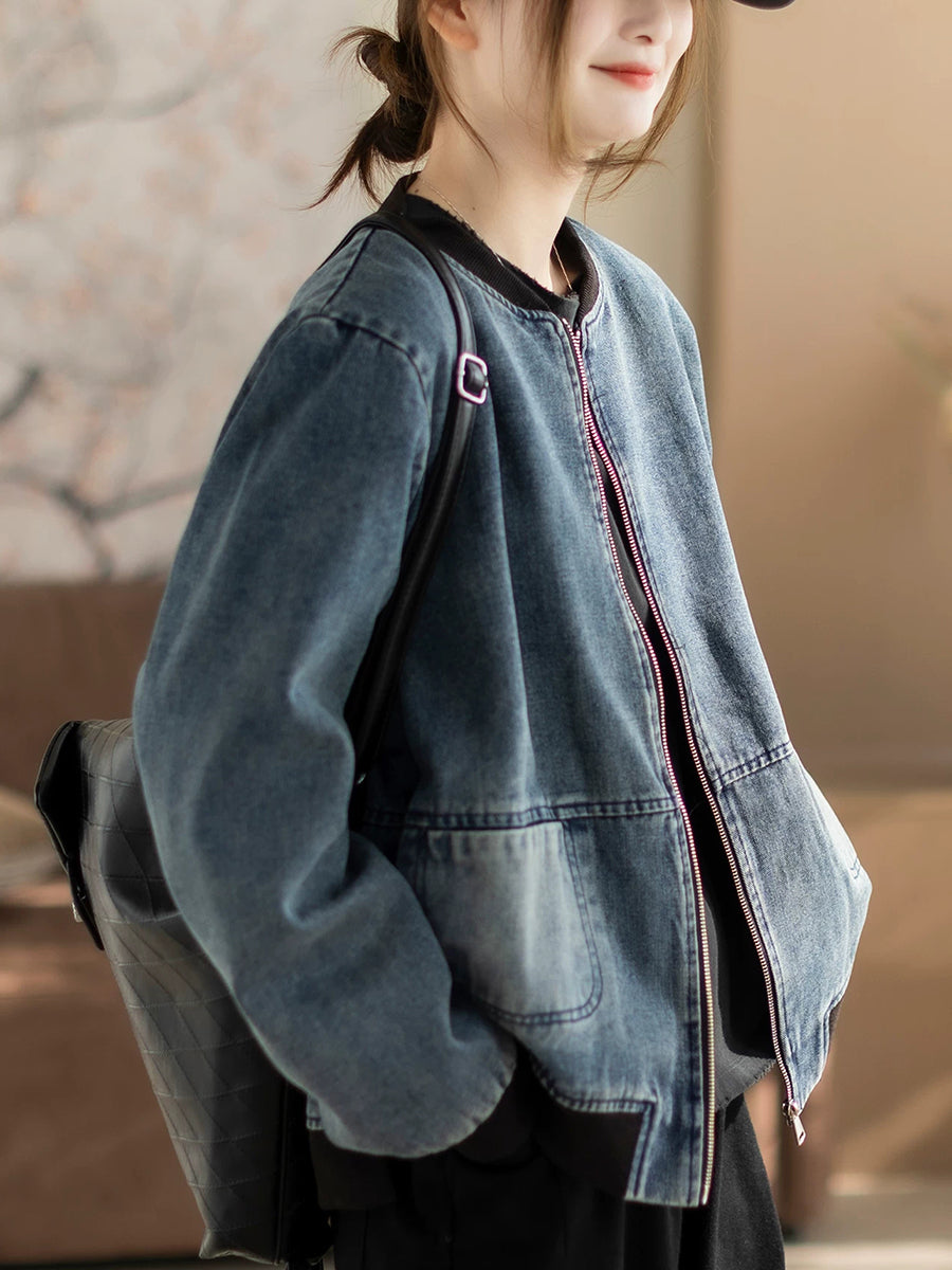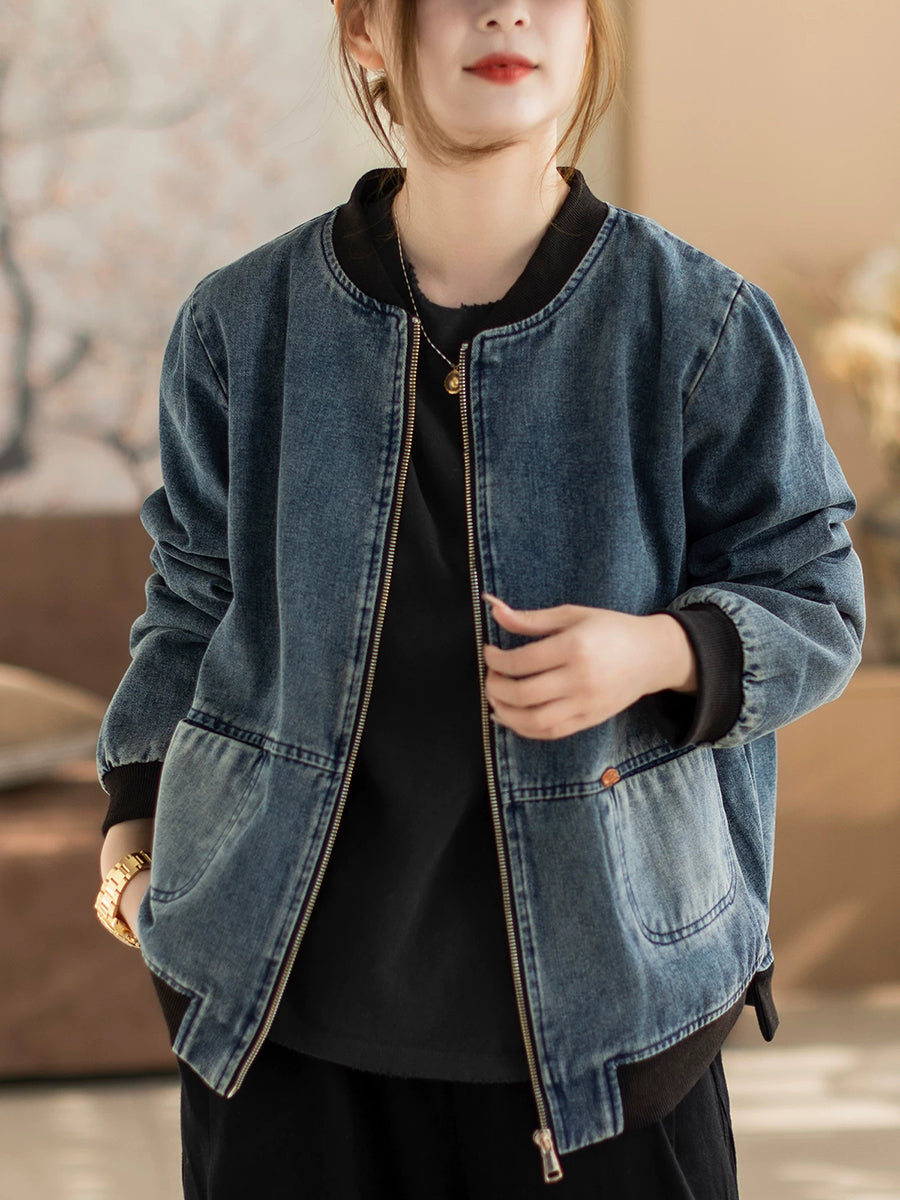 Women Spring Retro Denim Stand Collar Coat
