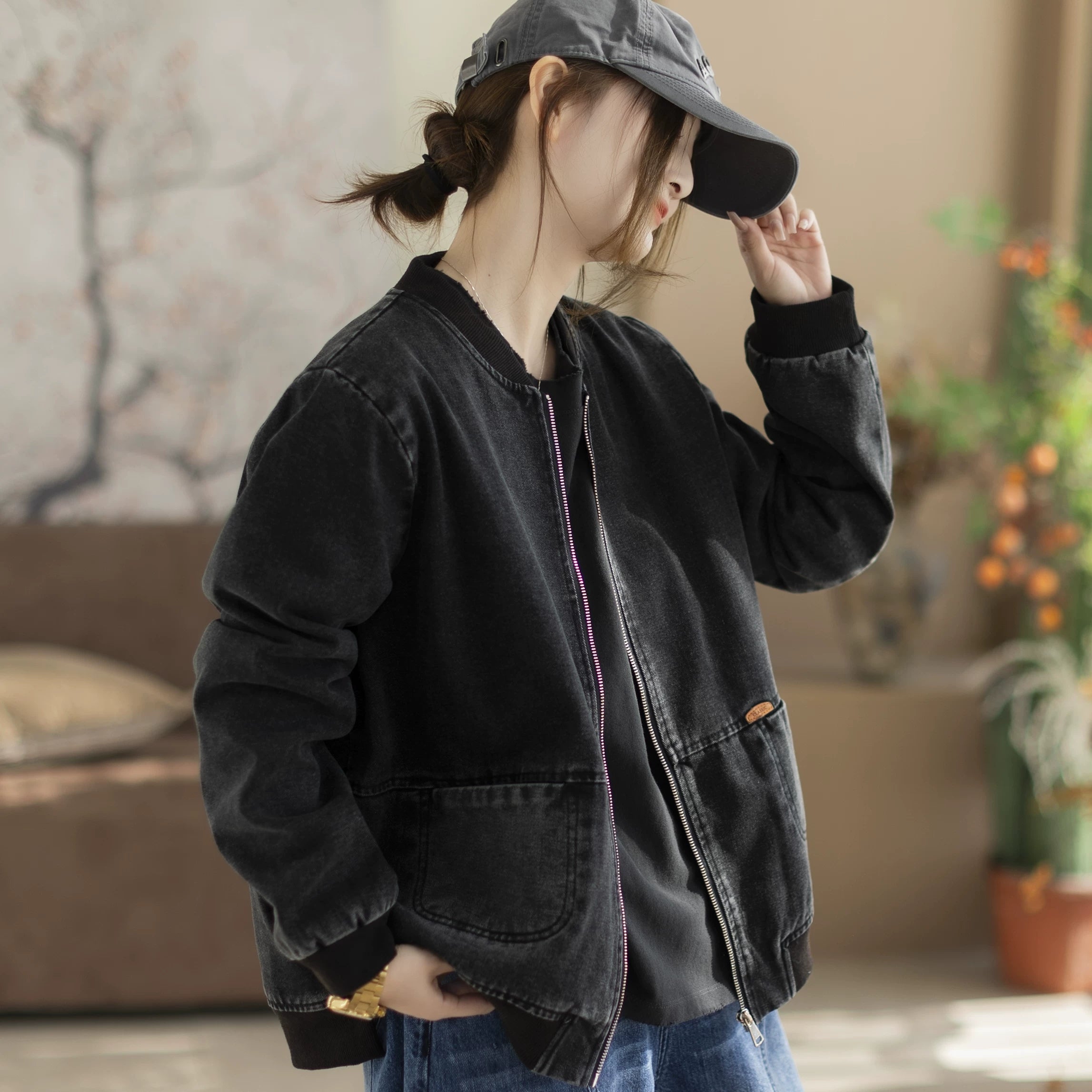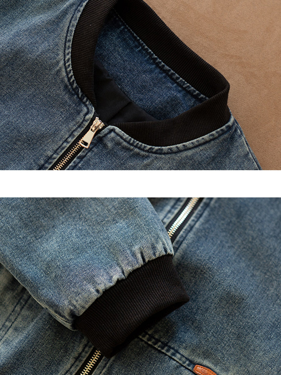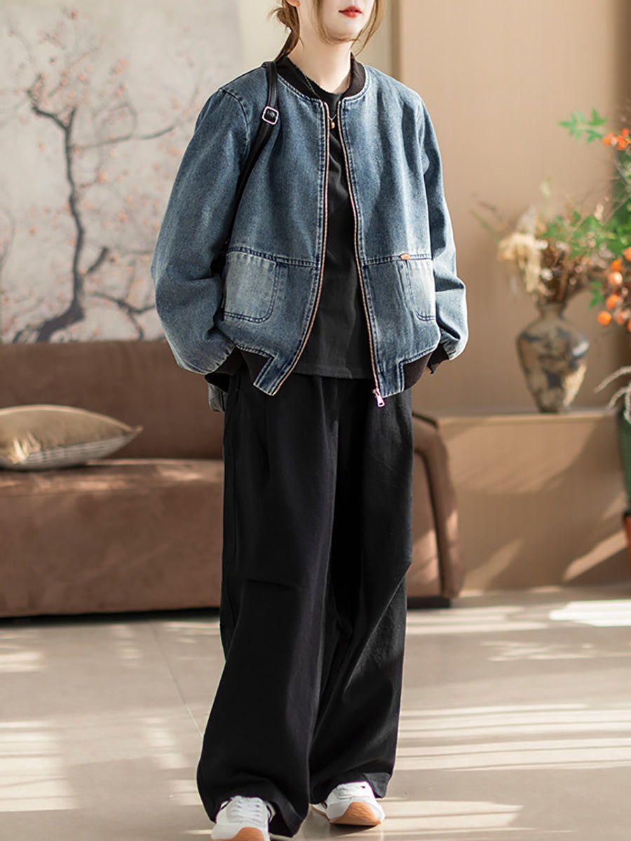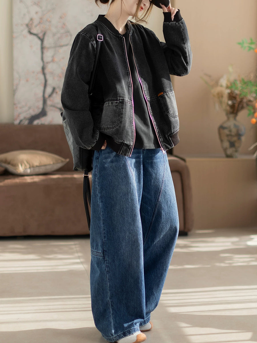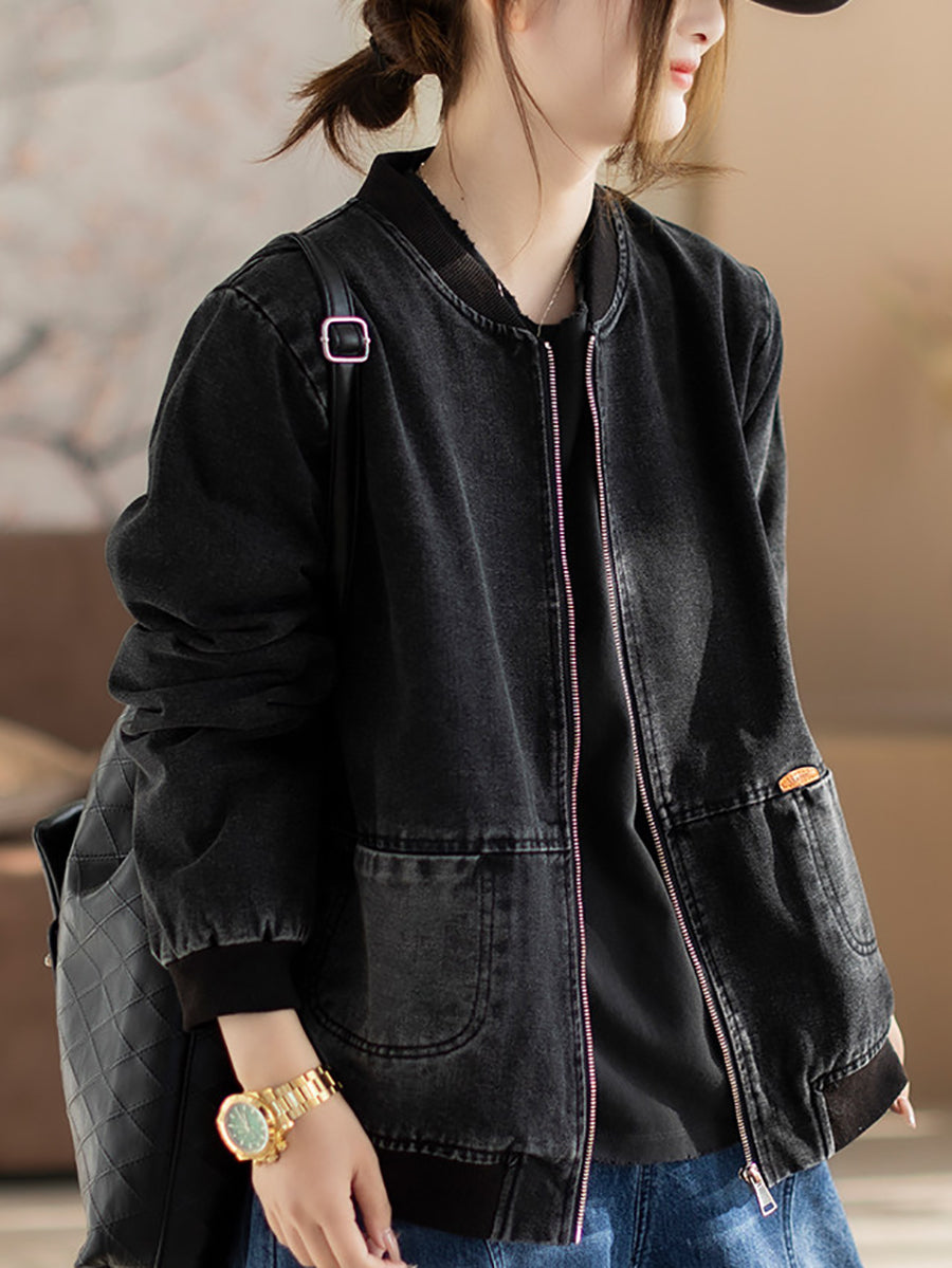 Women Spring Retro Denim Stand Collar Coat