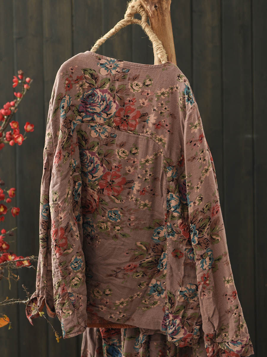 Women Spring Retro Flower V-Neck Cotton Blouse