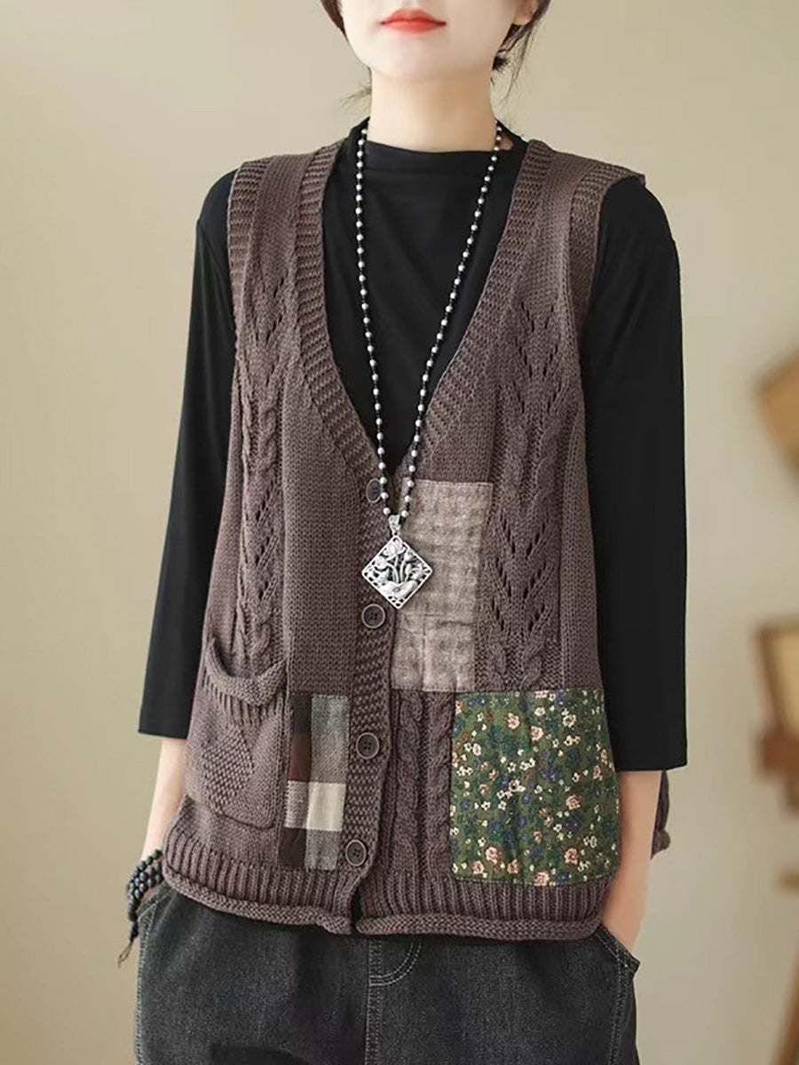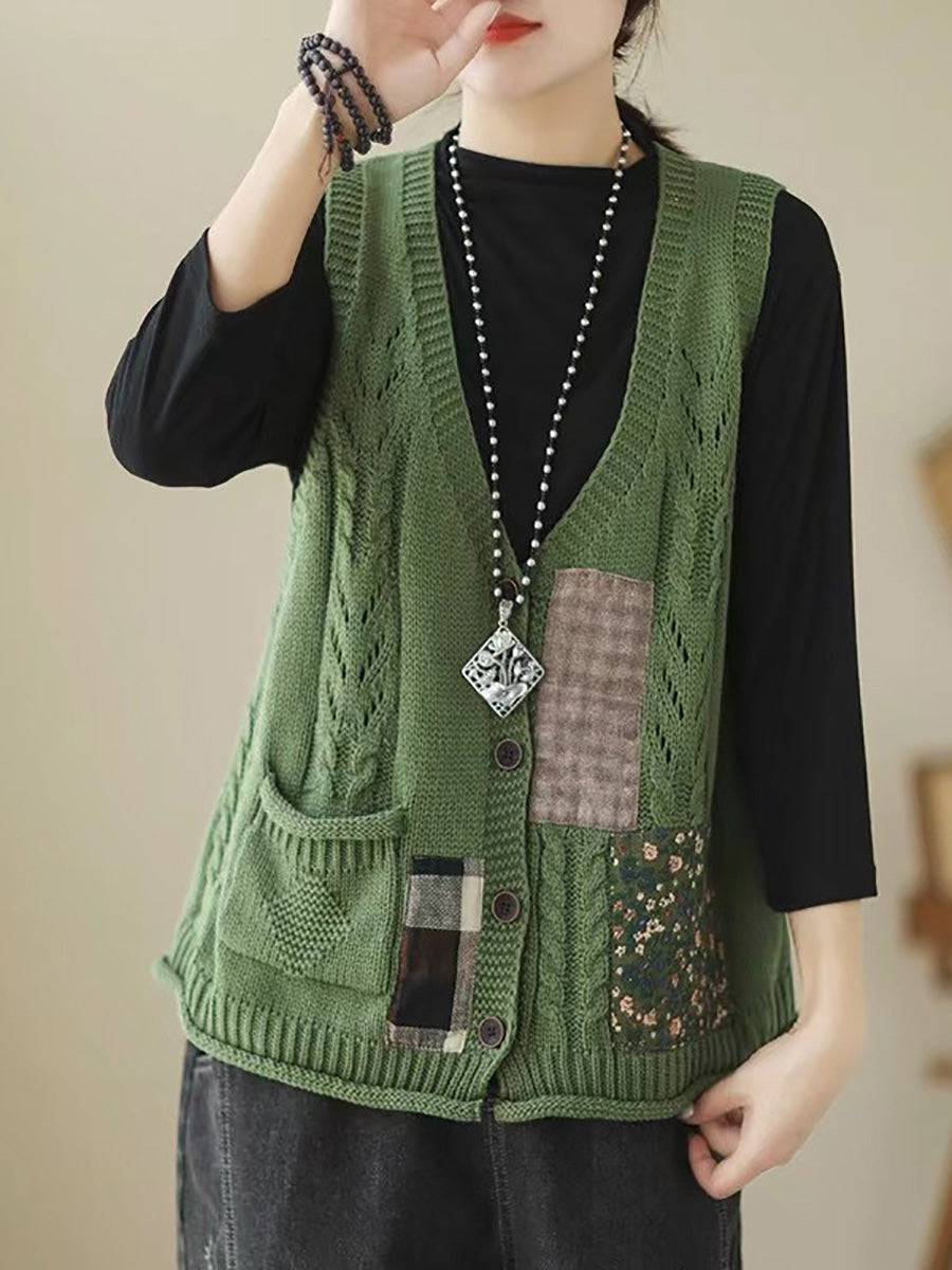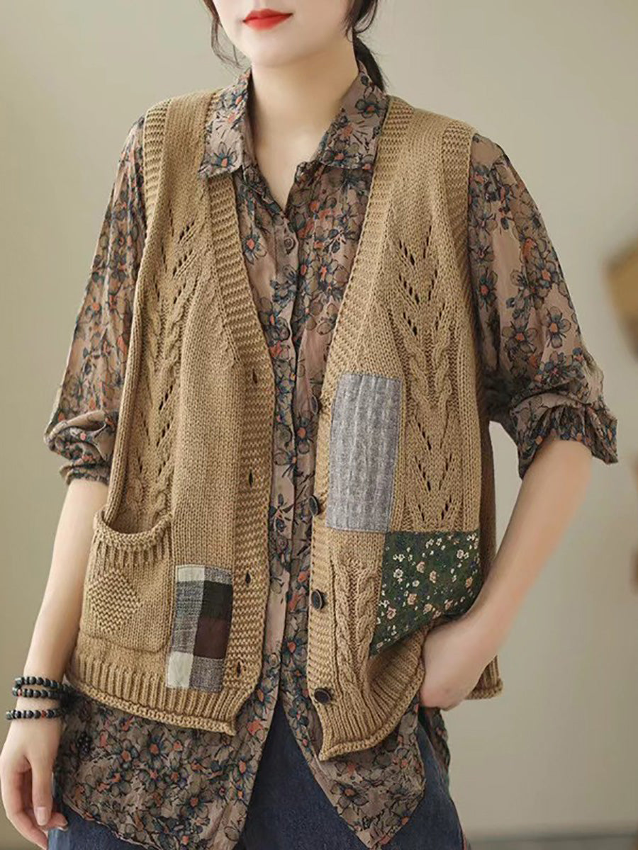 Women Spring Retro Patch Spliced Knitted Vest