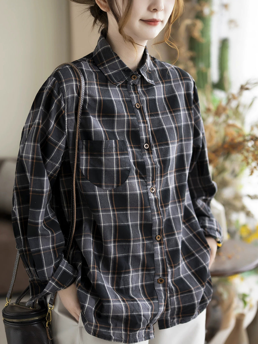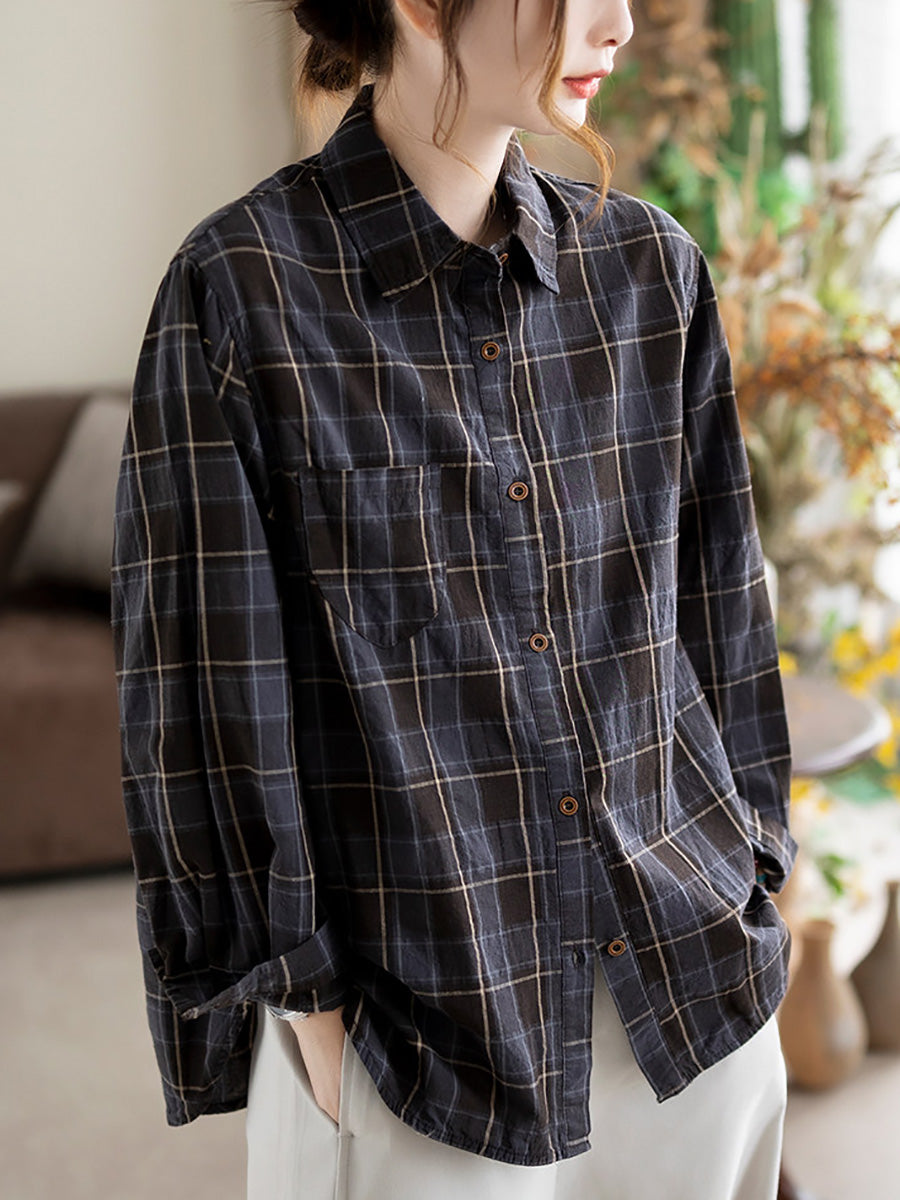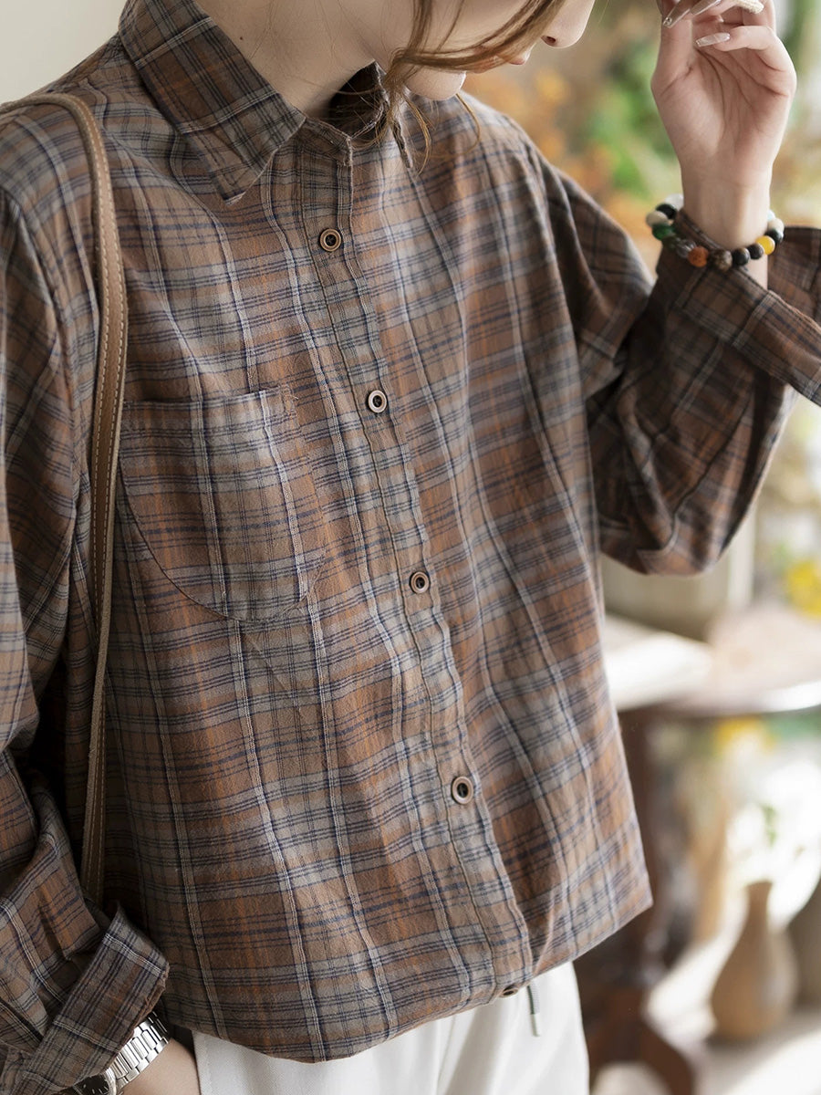 Women Spring Retro Plaid Cotton Turn-down Collar Shirt