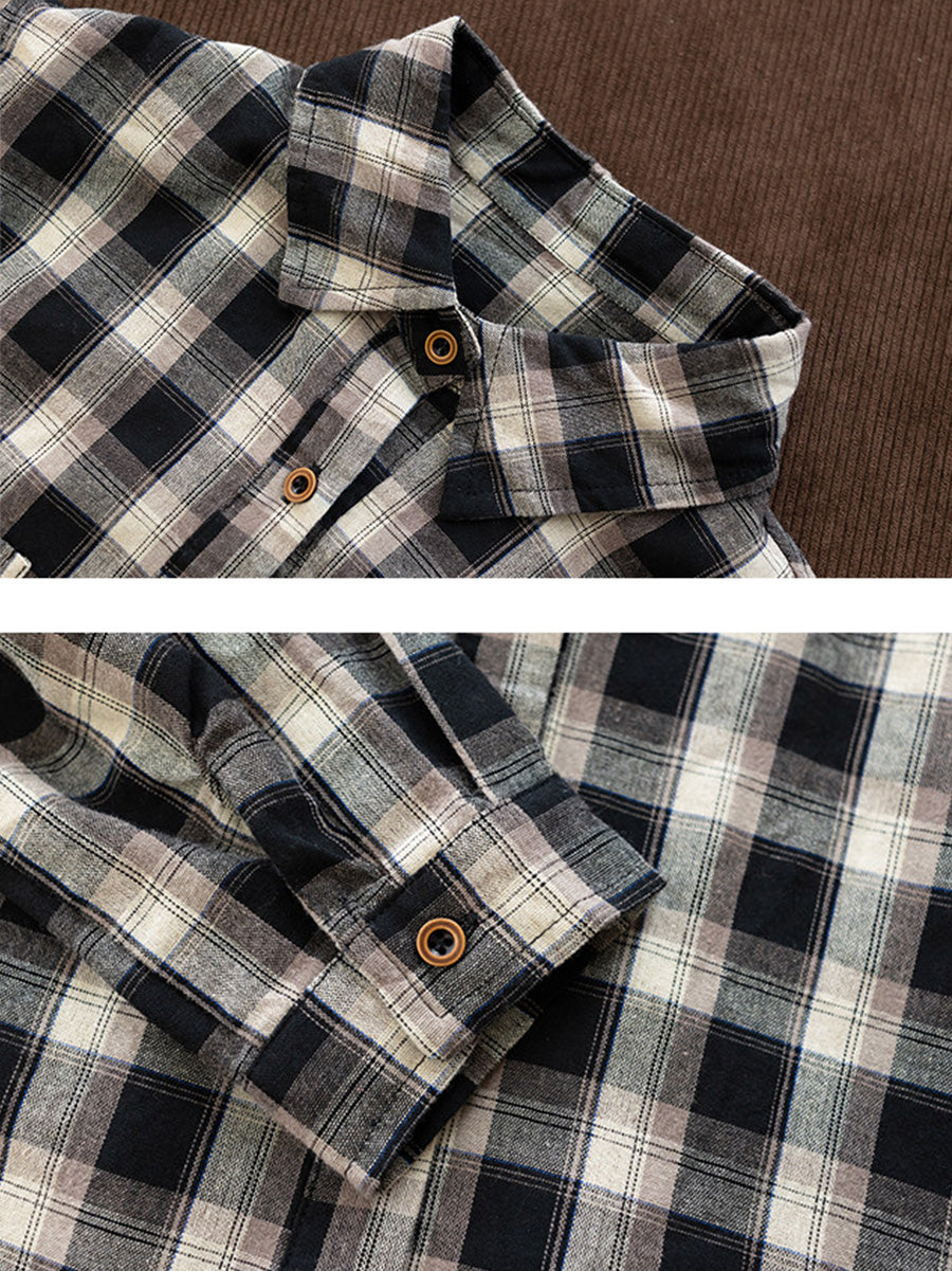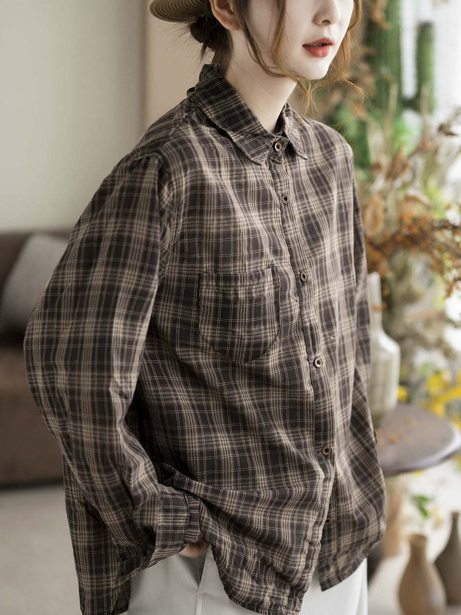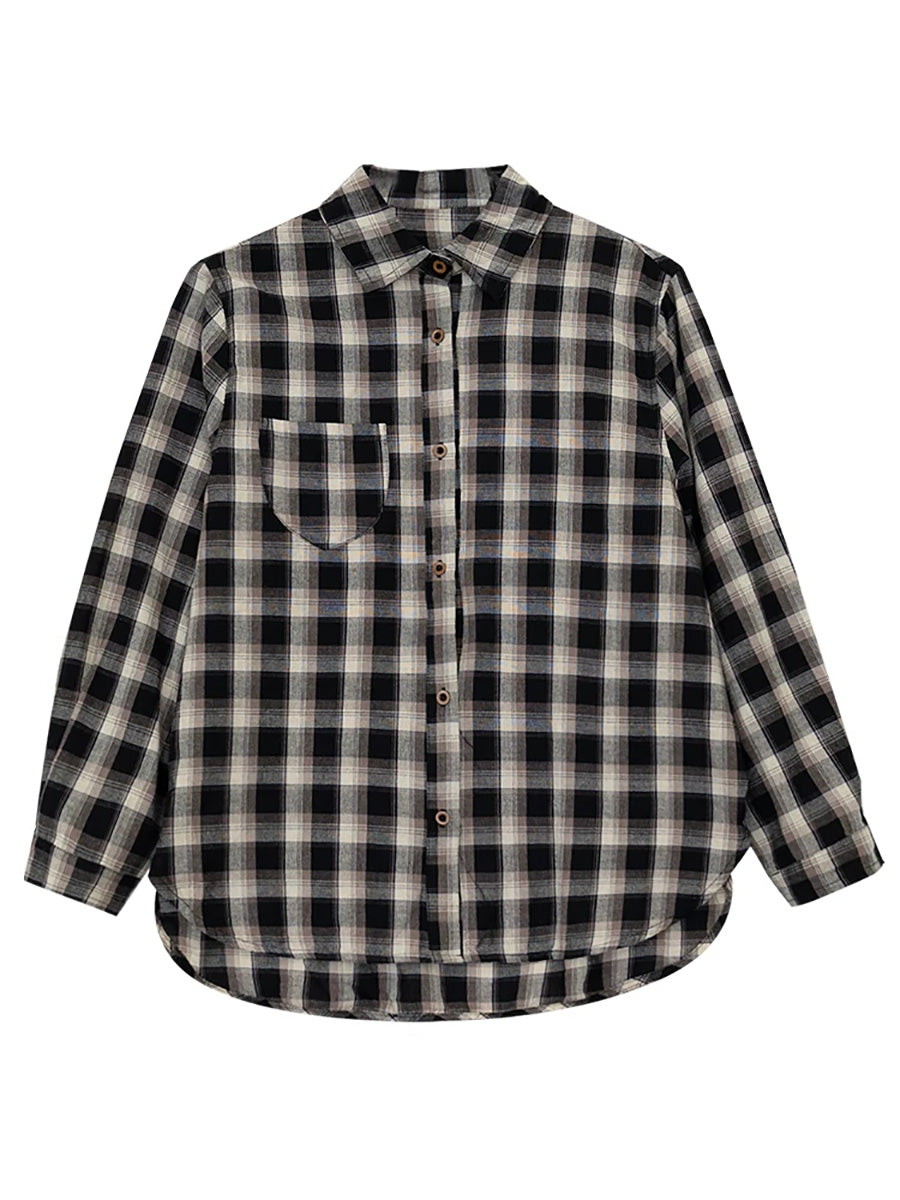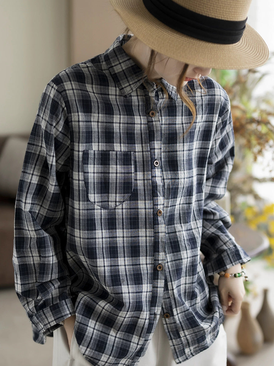 Women Spring Retro Plaid Cotton Turn-down Collar Shirt