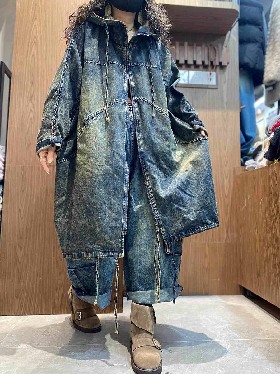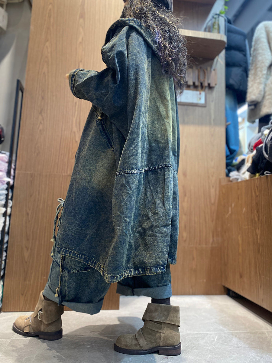 Women Spring Retro Pure Color Hooded Denim Coat