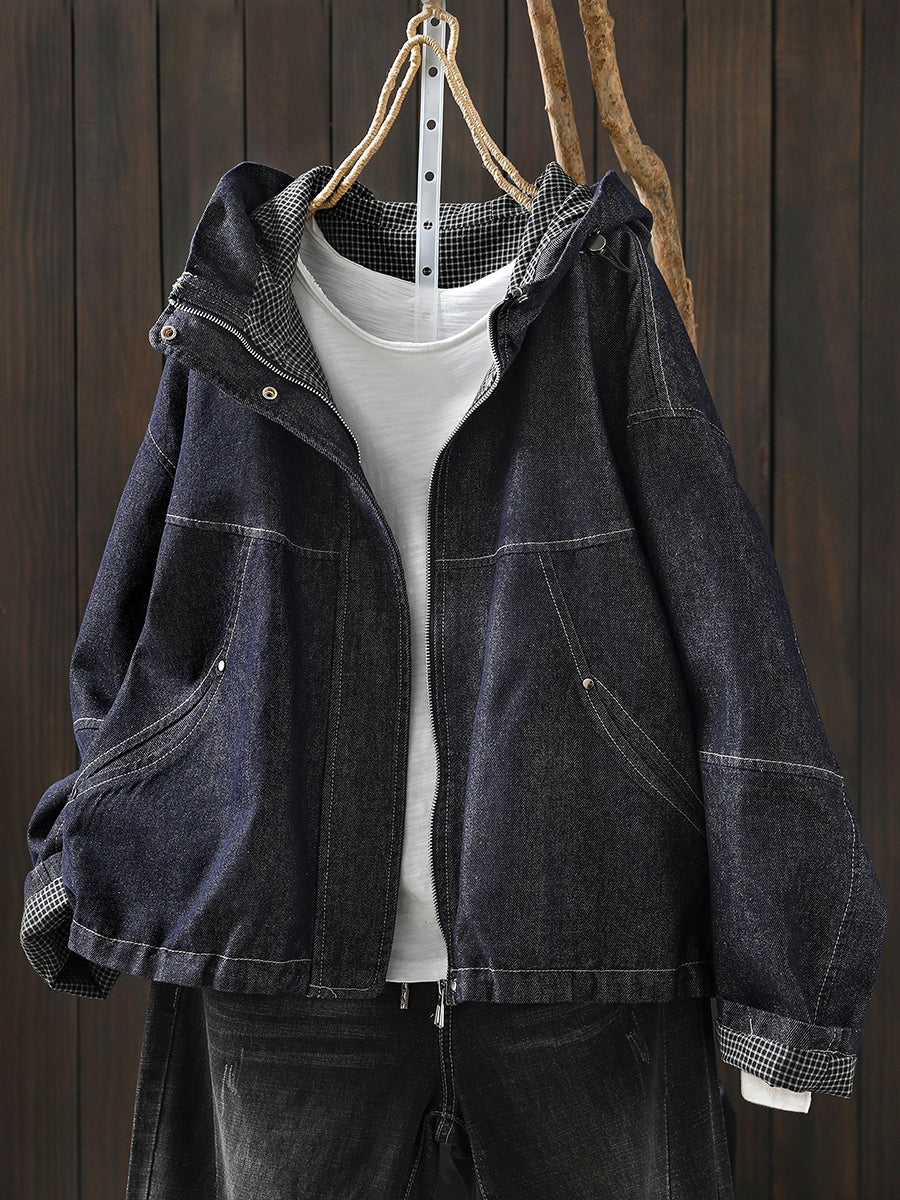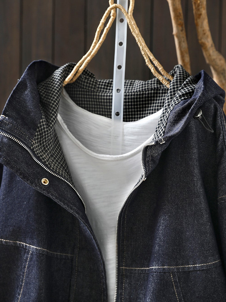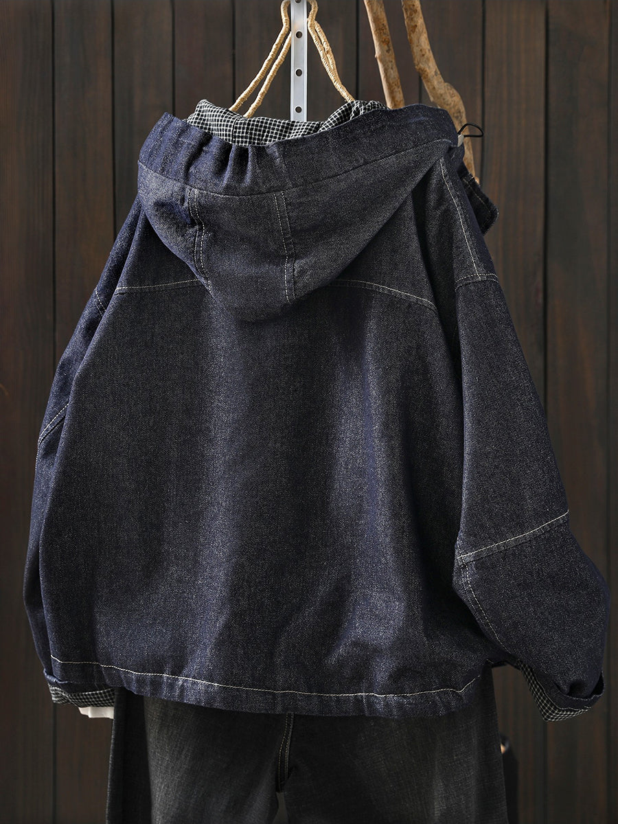 Women Spring Retro Pure Color Hooded Denim Coat
