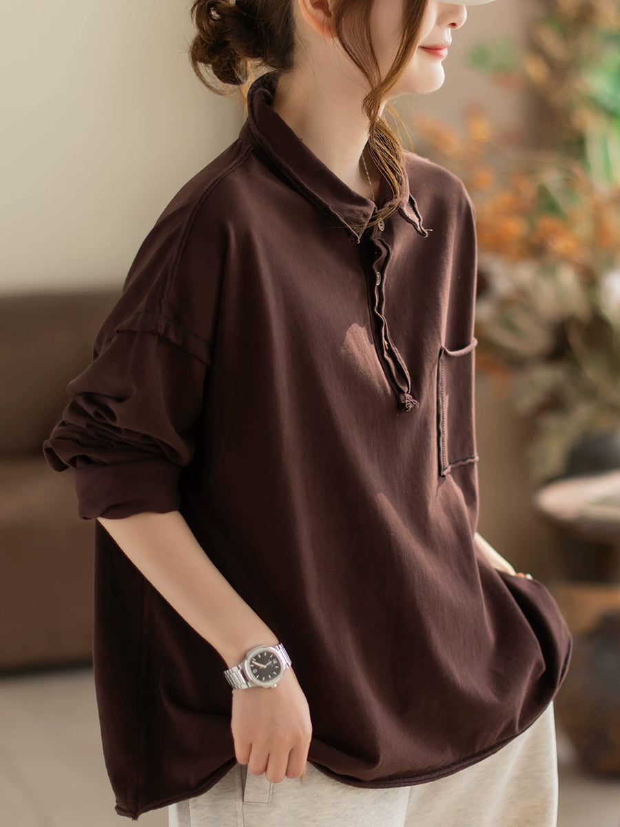 Women Spring Retro Pure Color Turn-down Collar Blouse