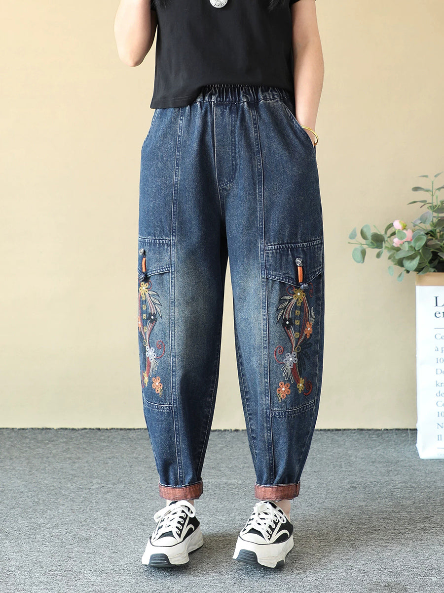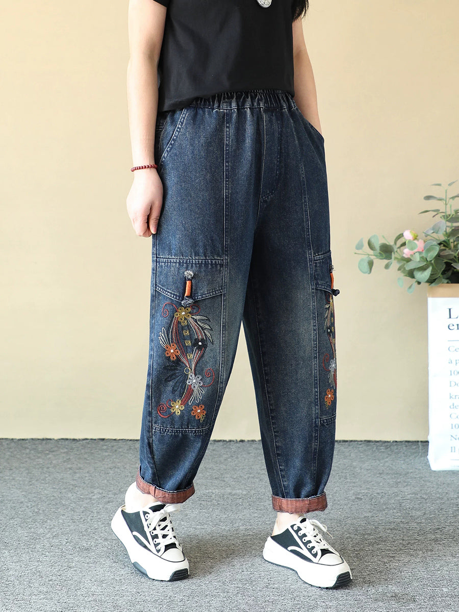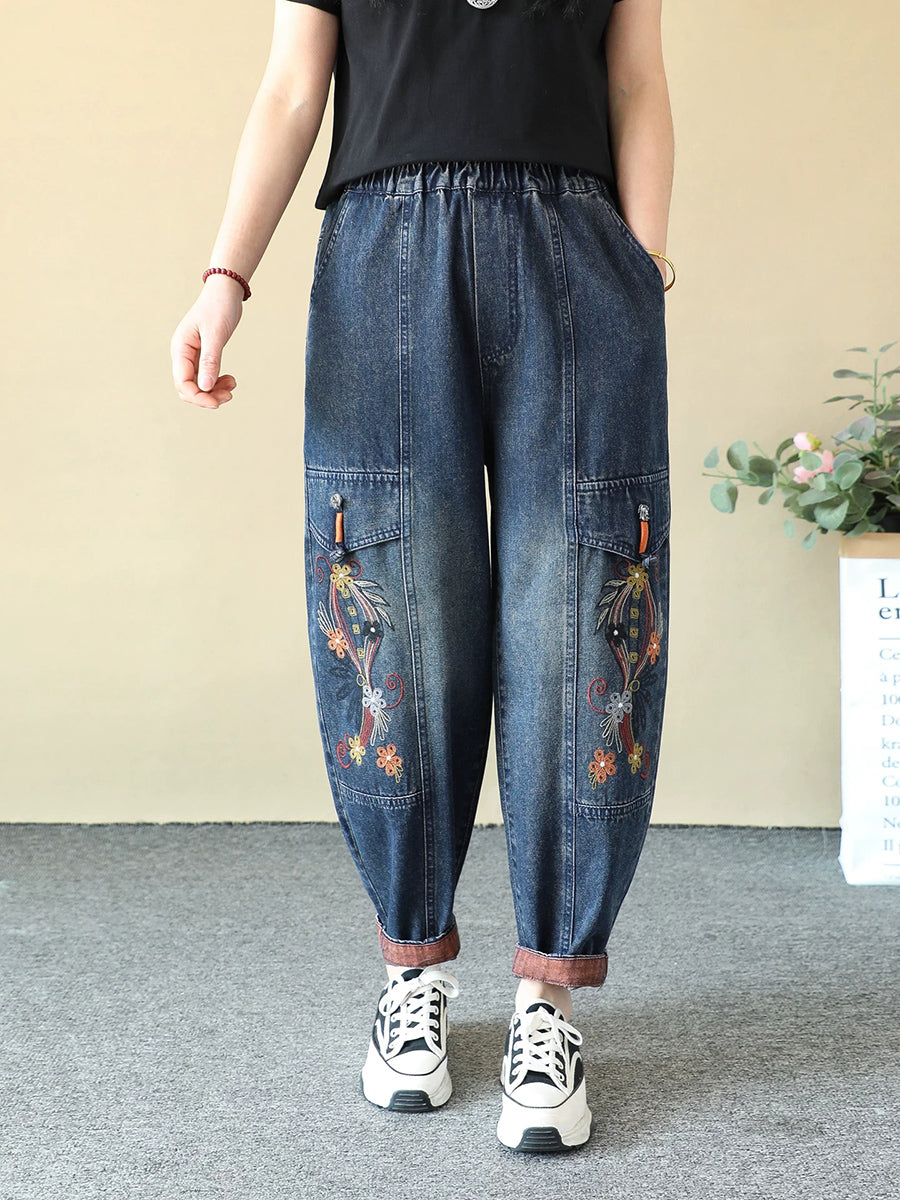 Women Spring Vintage Denim Embroidery Harem Jeans