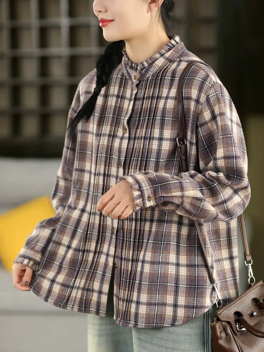 Women Spring Vintage Plaid Turn-down Collar Shirt