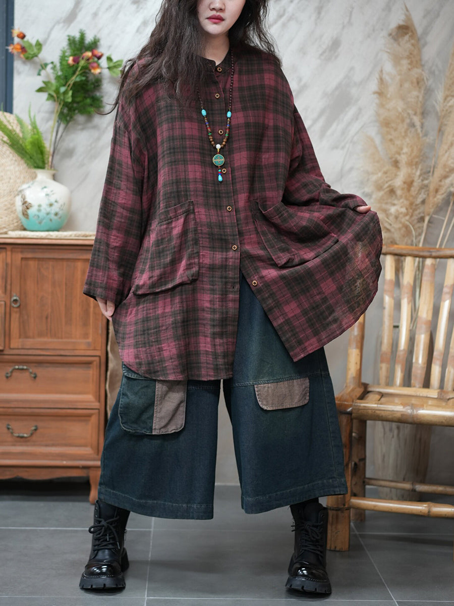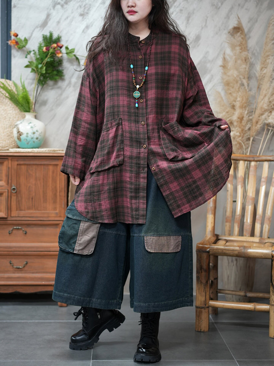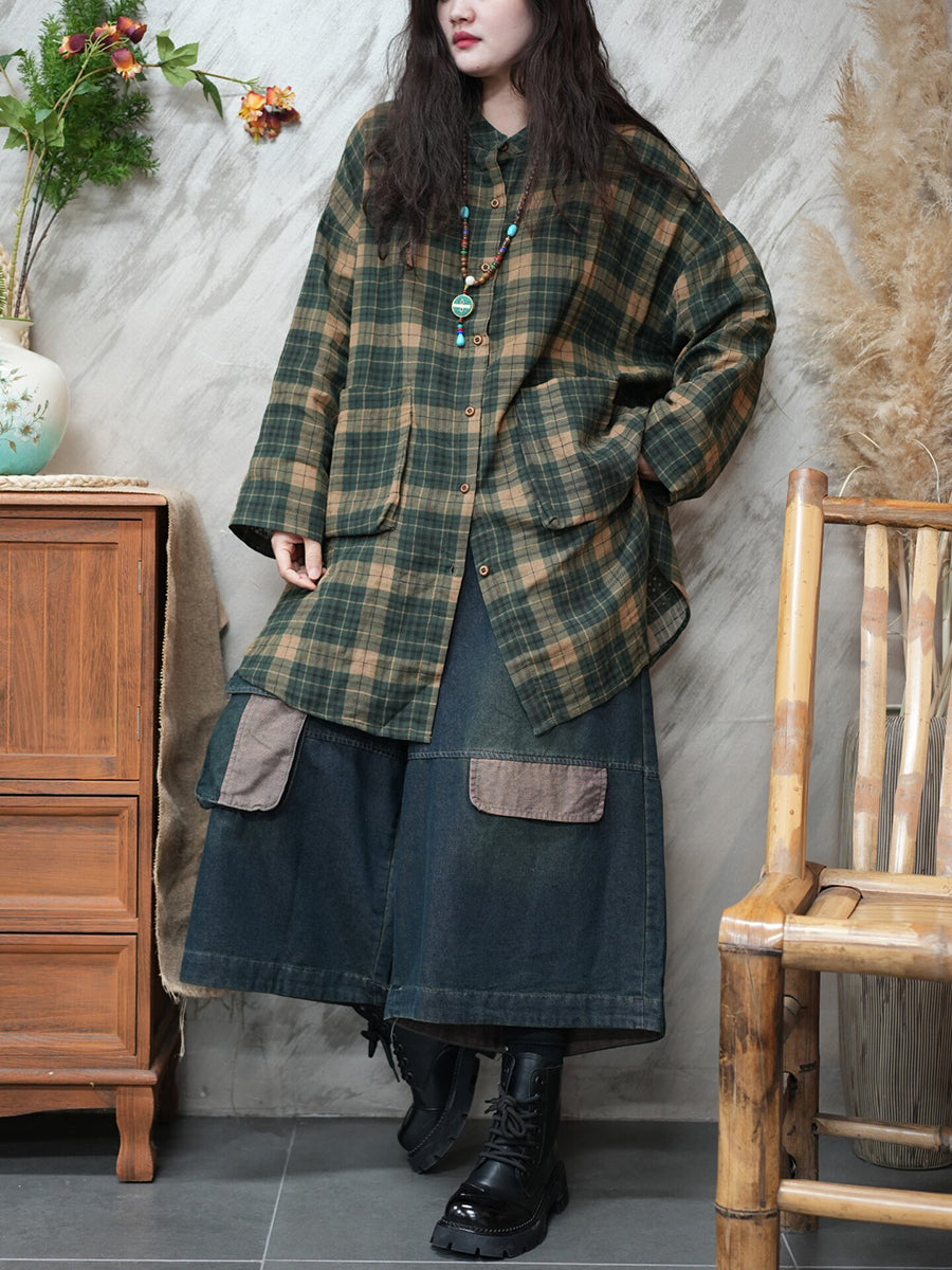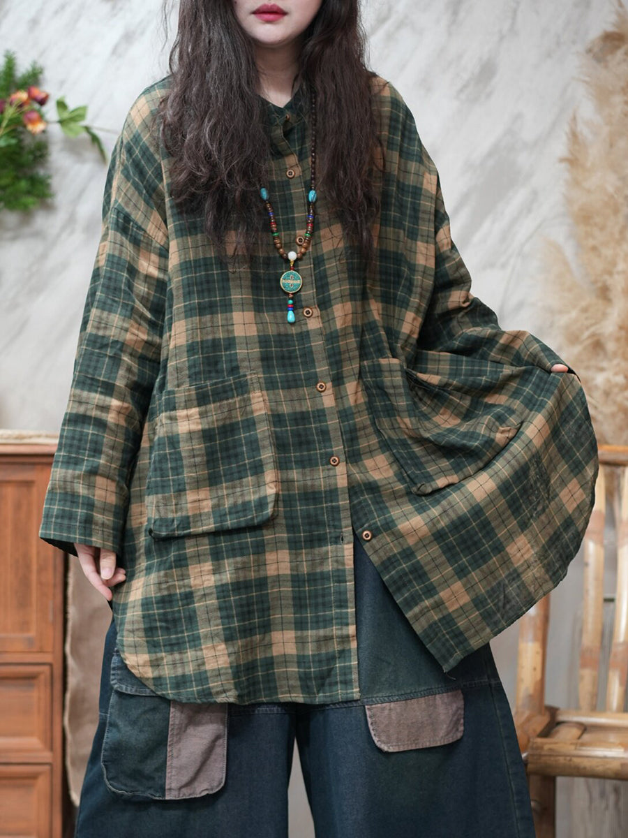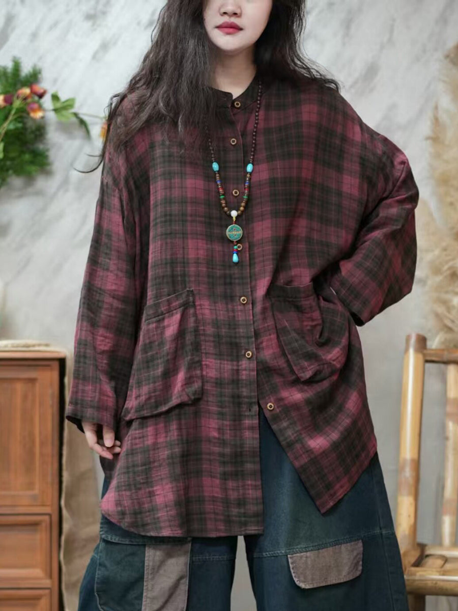 Women Spring Vintage Plaid Turn-down Collar Shirt