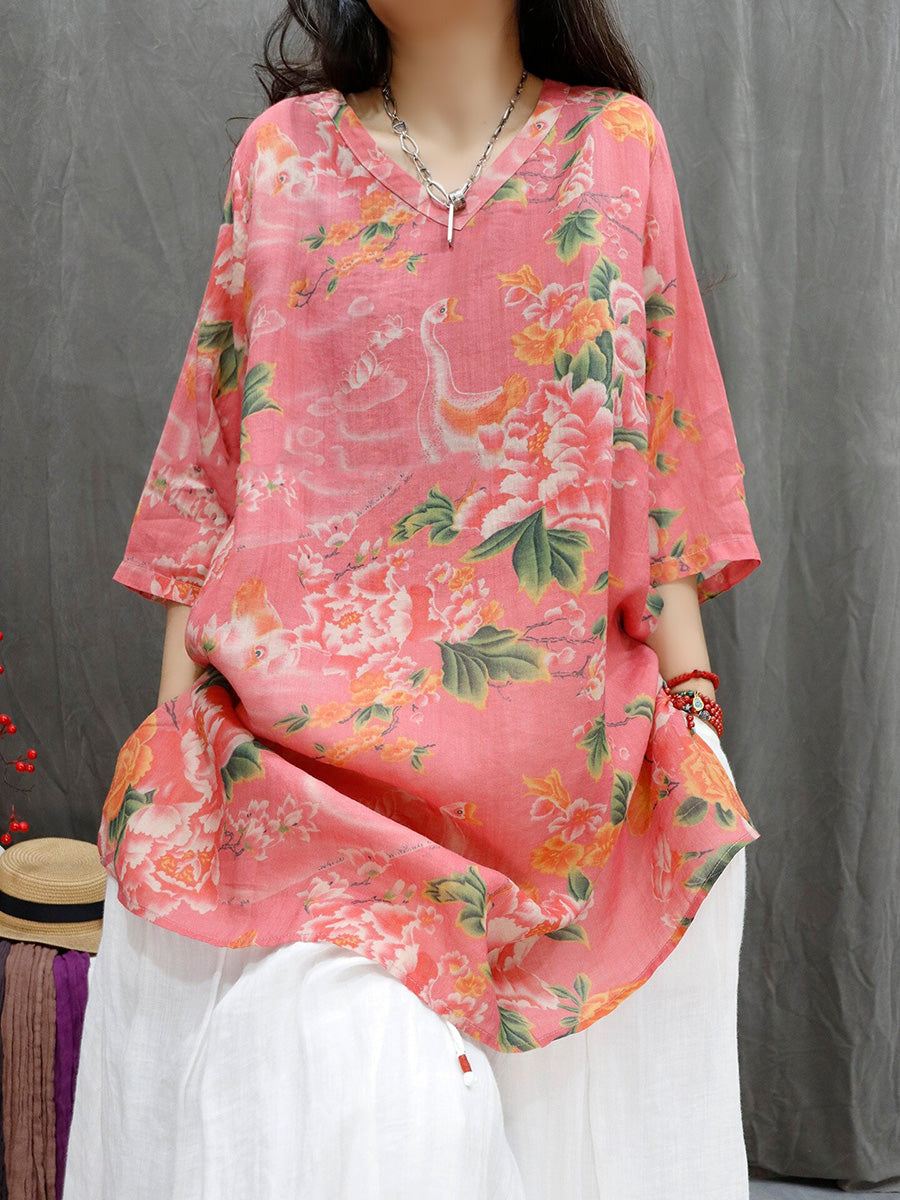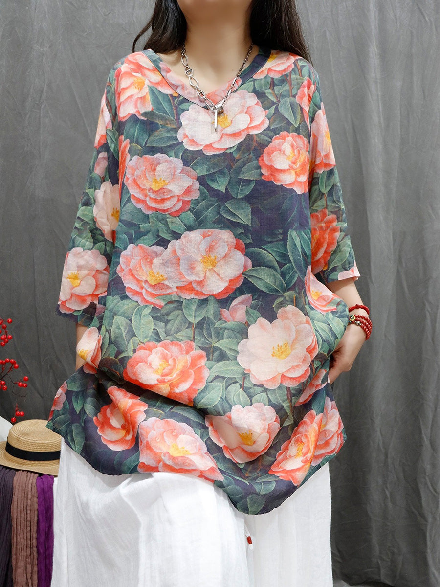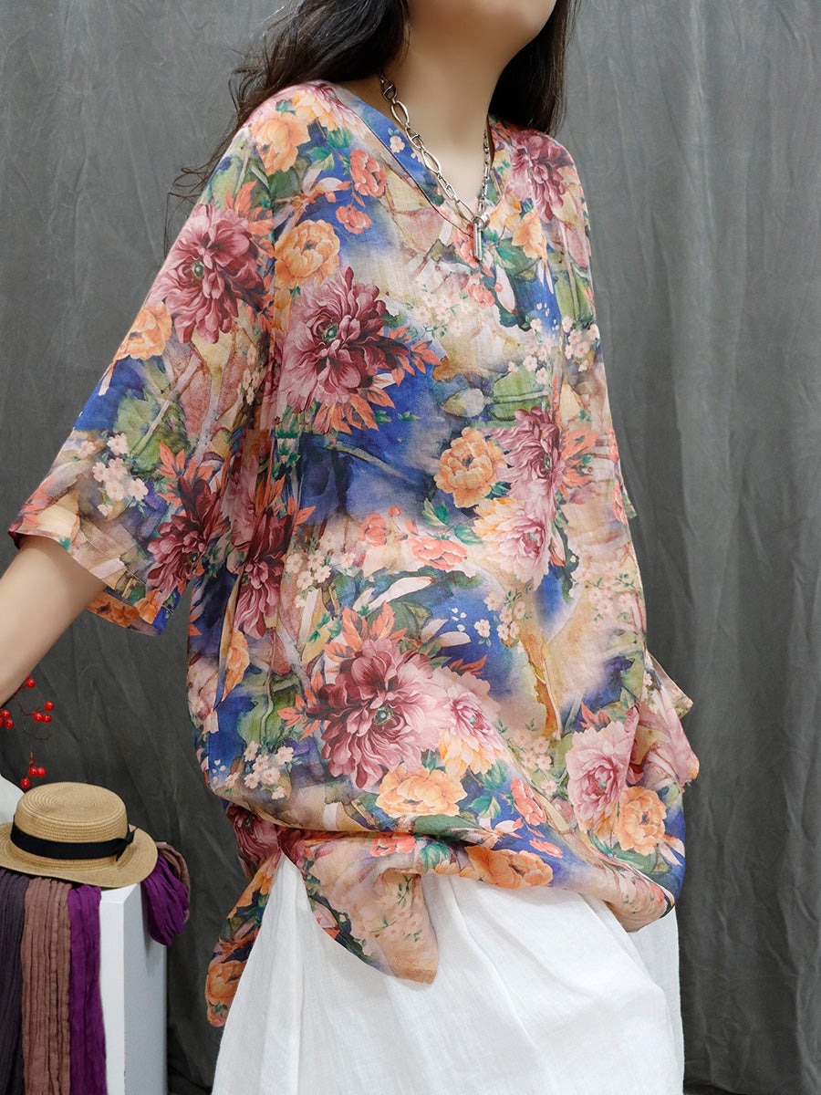 Women Summer Artsy Flower V-Neck 100%Ramie Shirt