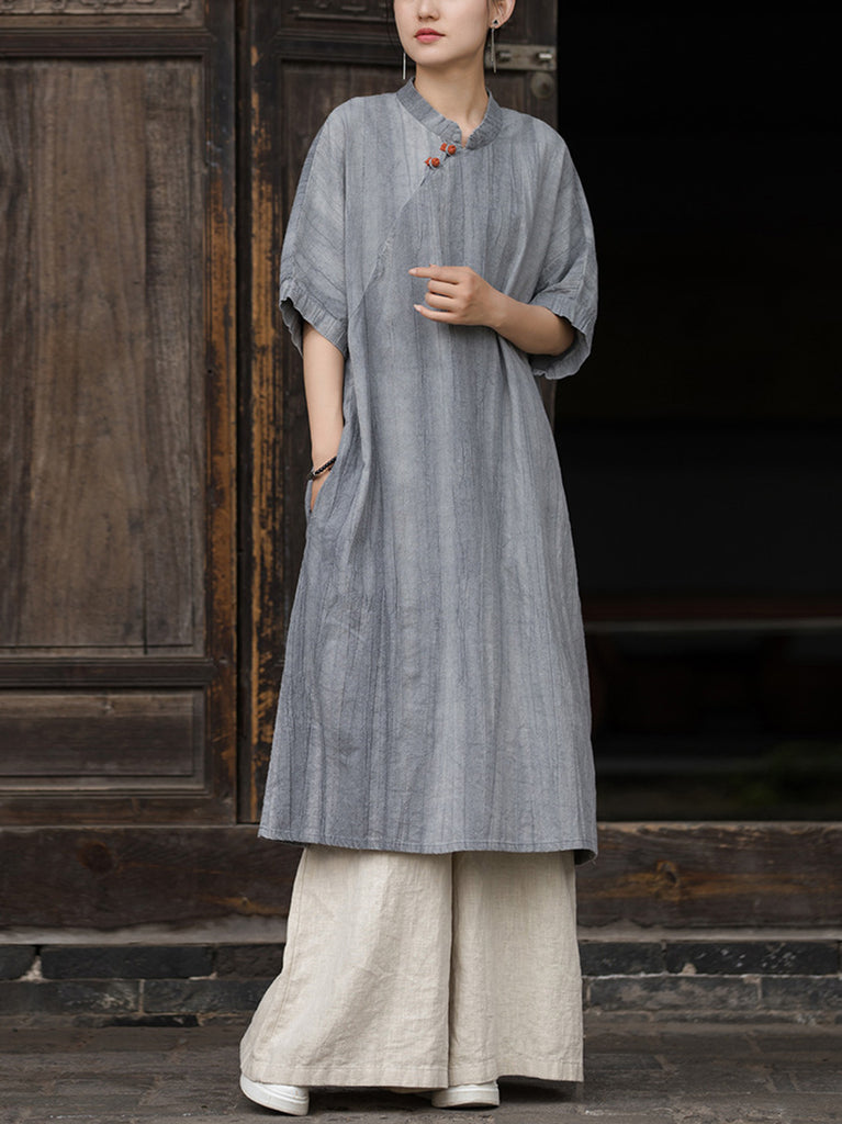 Women Summer Artsy Tie-dye Stand Collar Ramie Dress