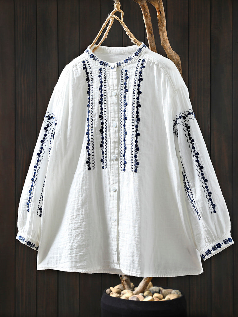 Women Summer Embroidery Stand Collar 100%Cotton Shirt