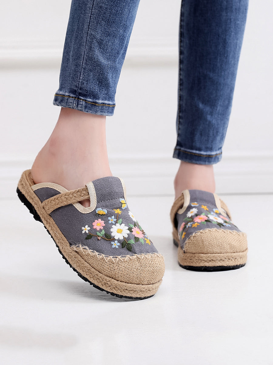 Women Summer Ethnic Flower Embroidery Canvas Slippers