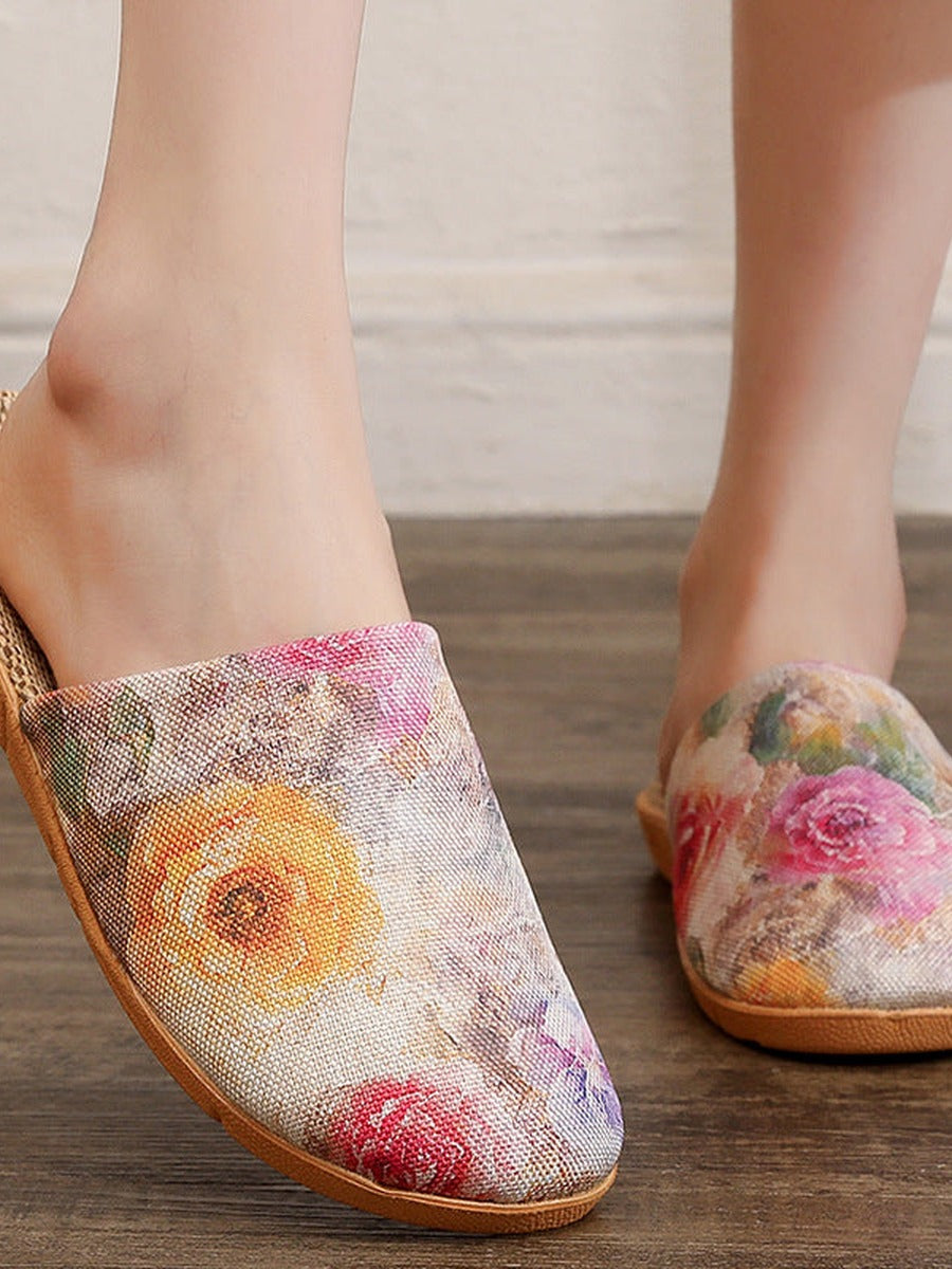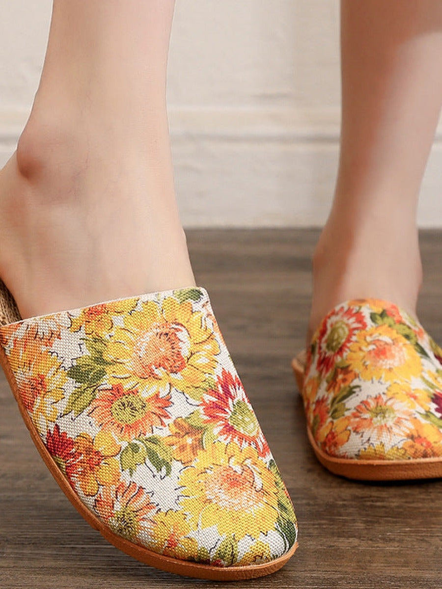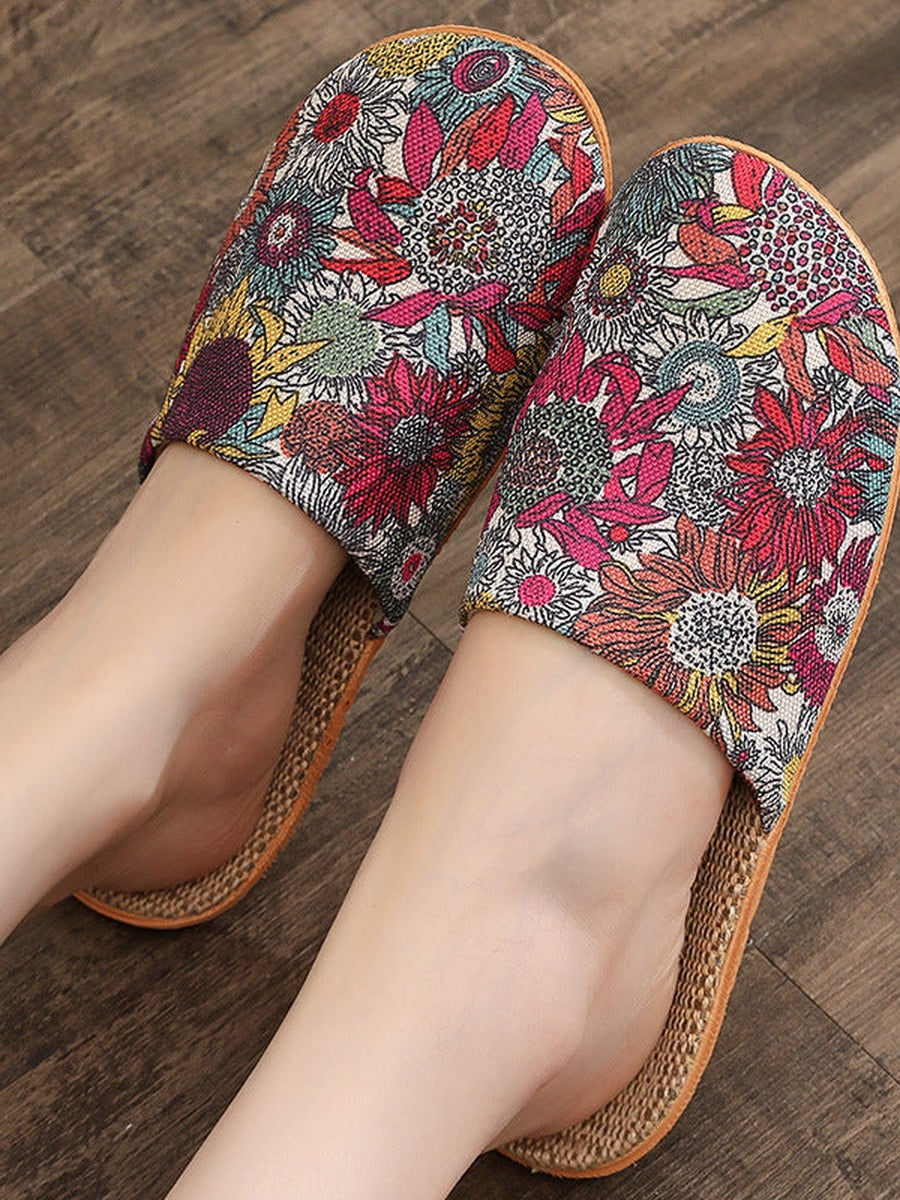 Women Summer Floral Printed Linen Open-Toe Slippers