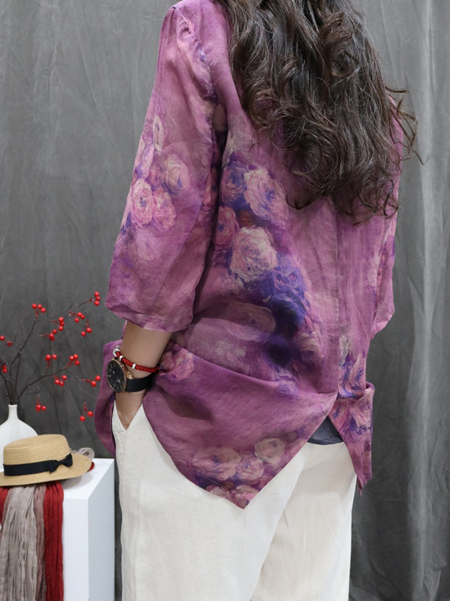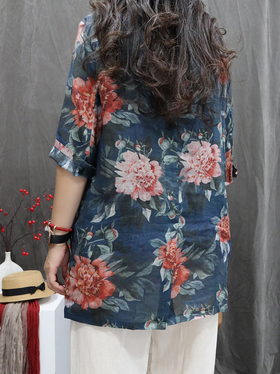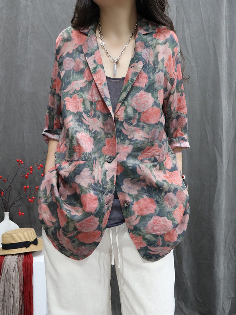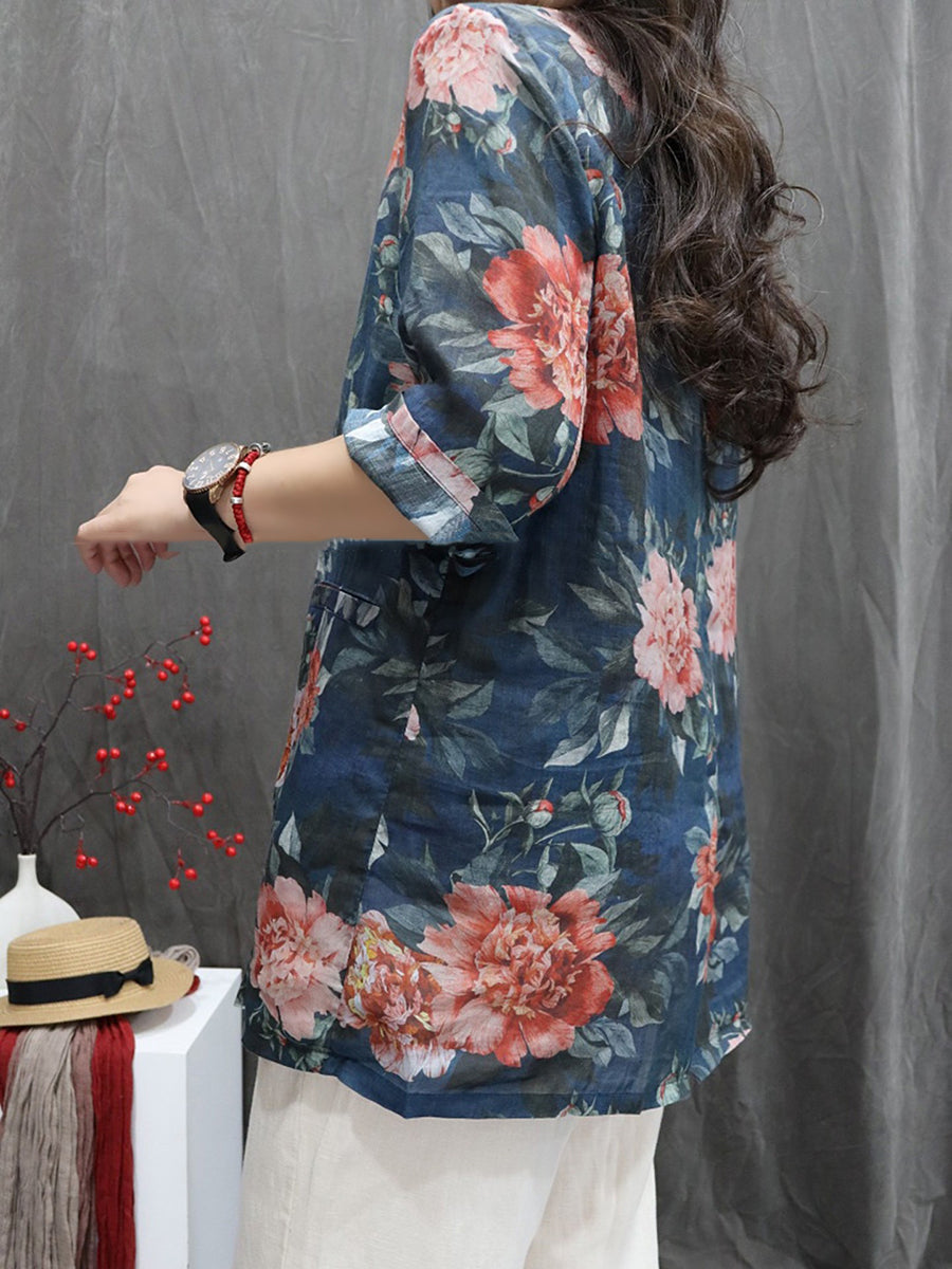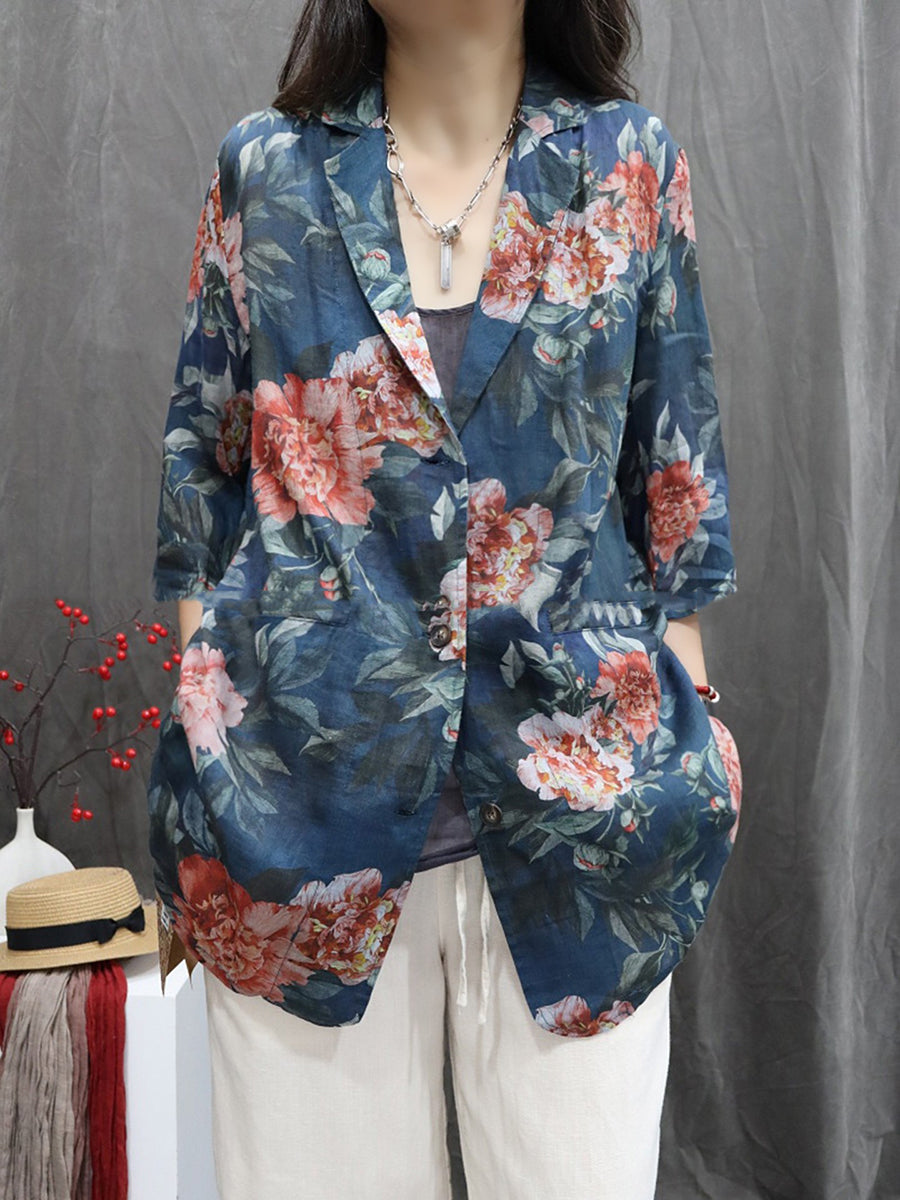 Women Summer Flower 100%Ramie Turn-down Collar Coat