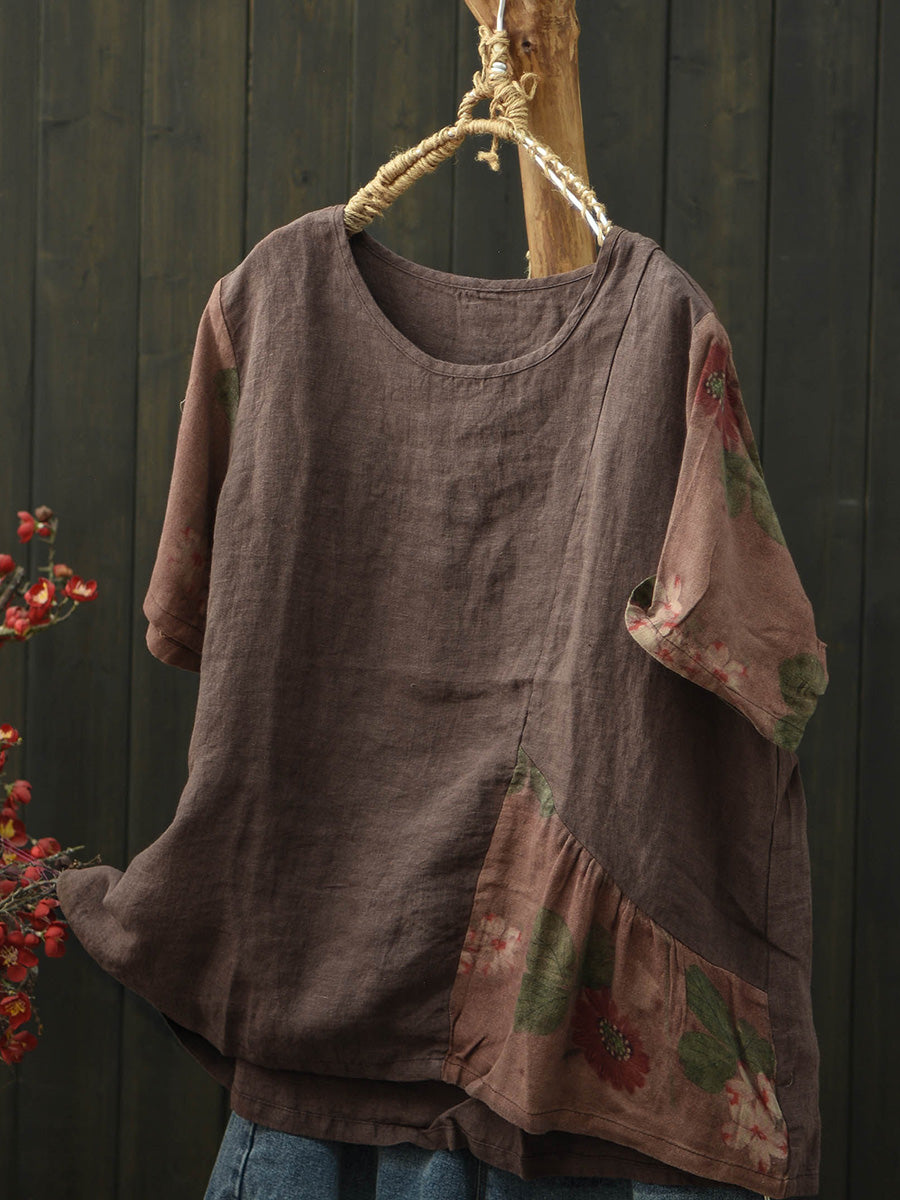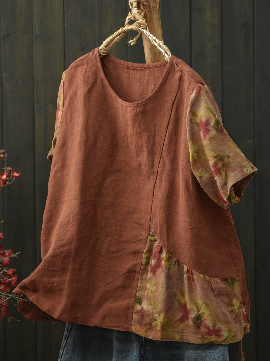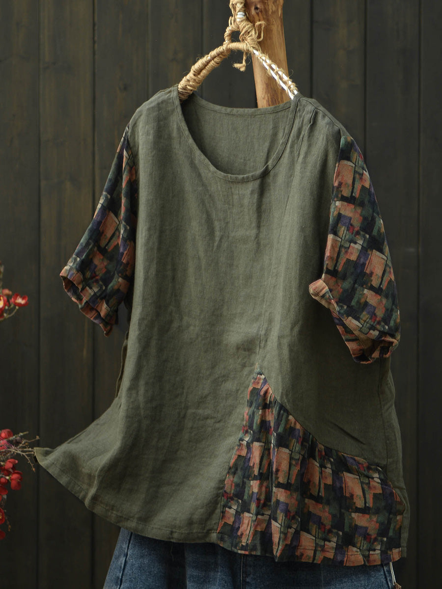 Women Summer Patchwork Linen Short Sleeve T-Shirt