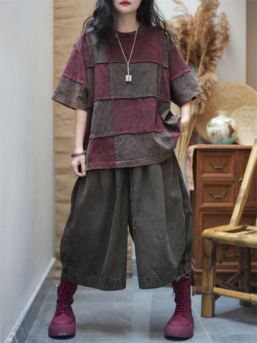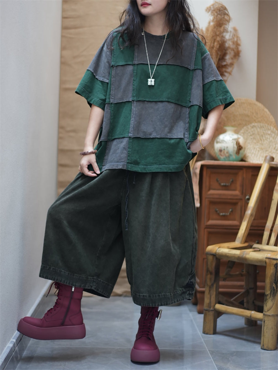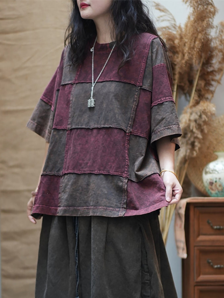 Women Summer Retro Colorblock Plaid O-Neck Cotton Shirt