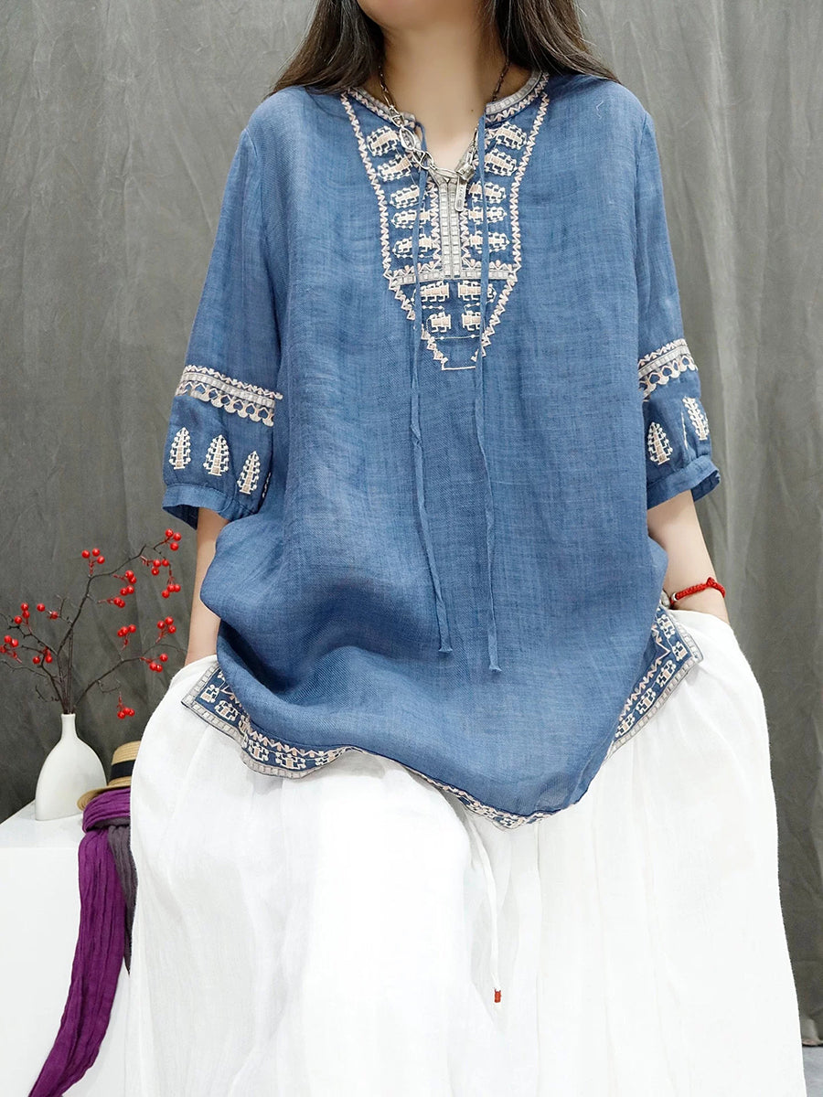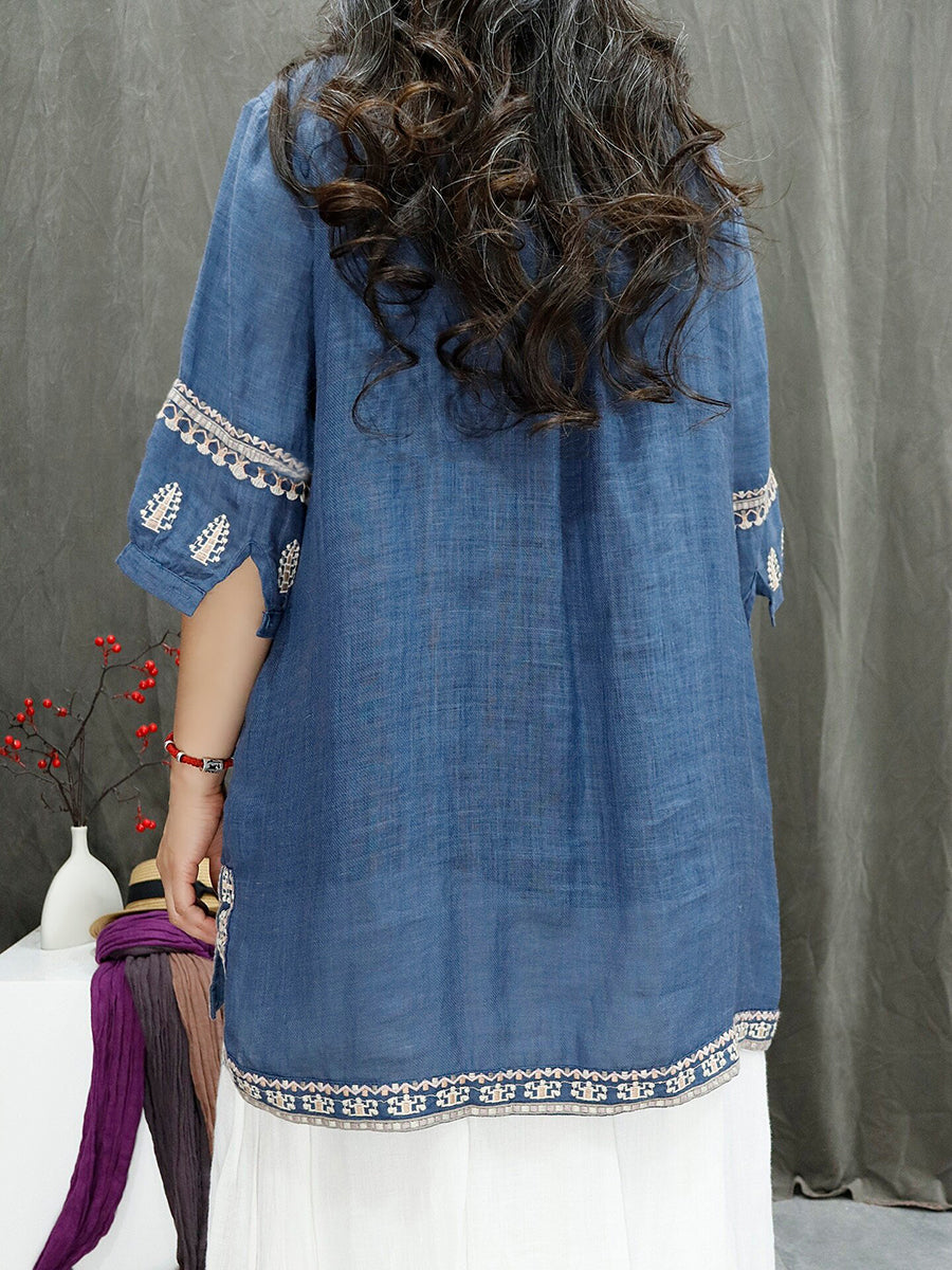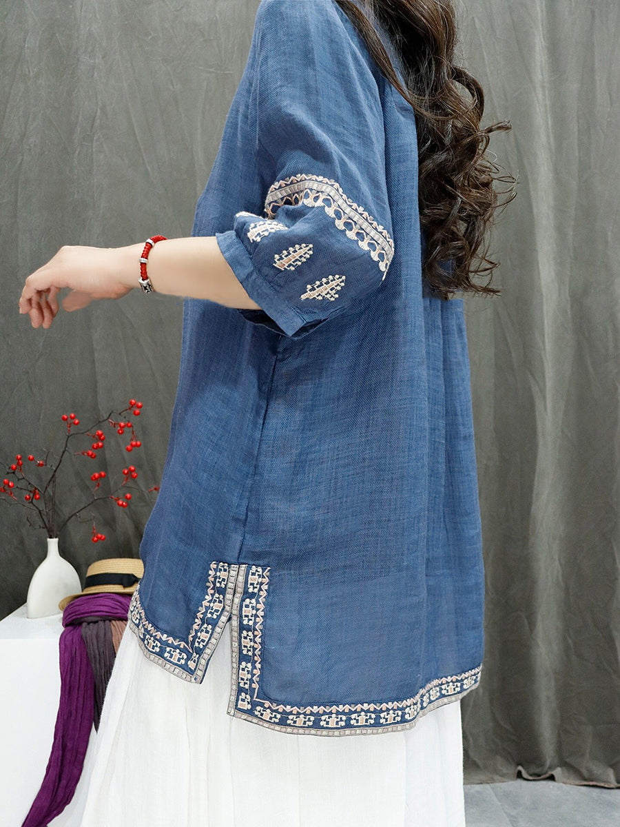 Women Summer Retro Embroidery 100%Ramie Blouse