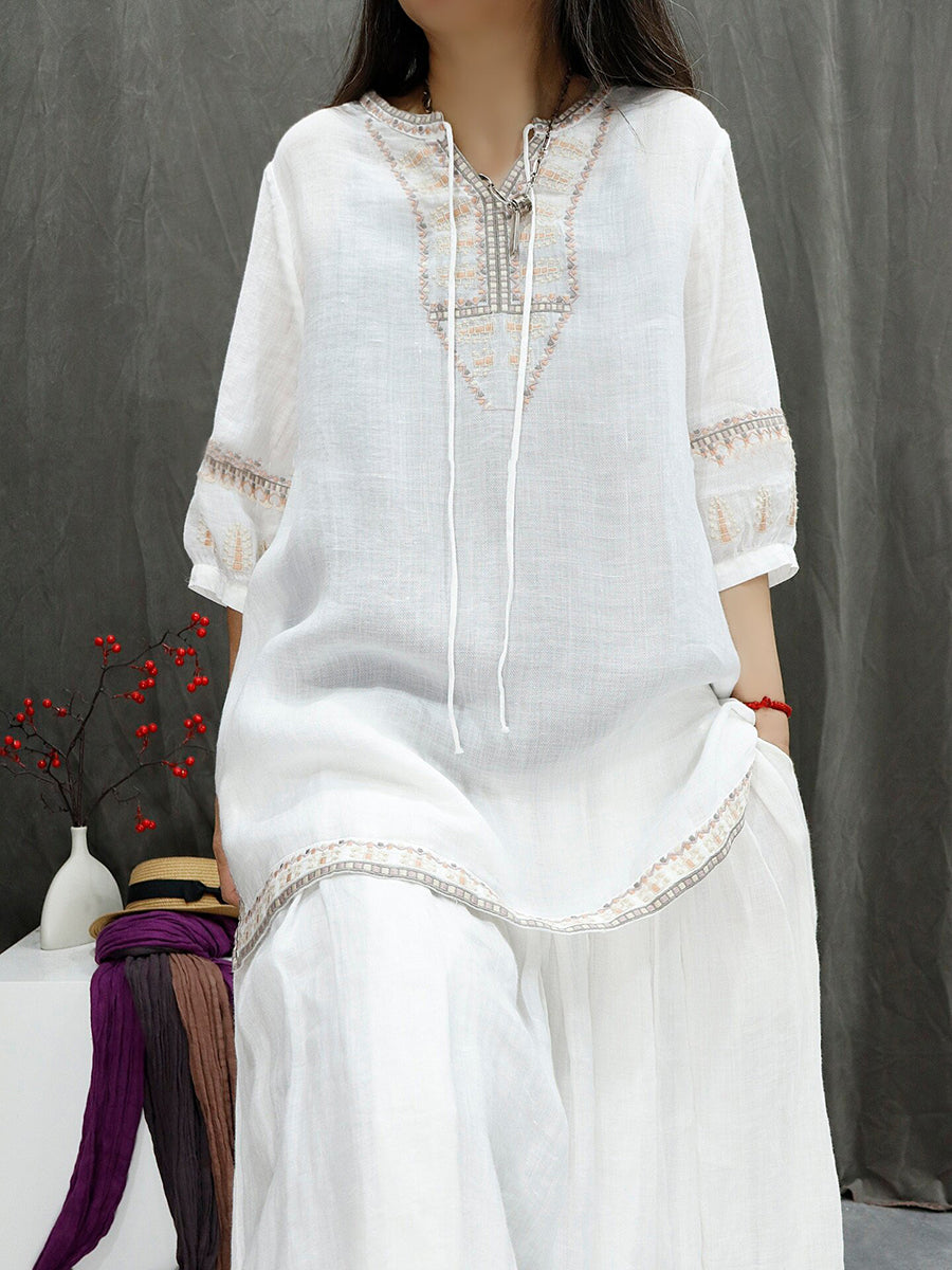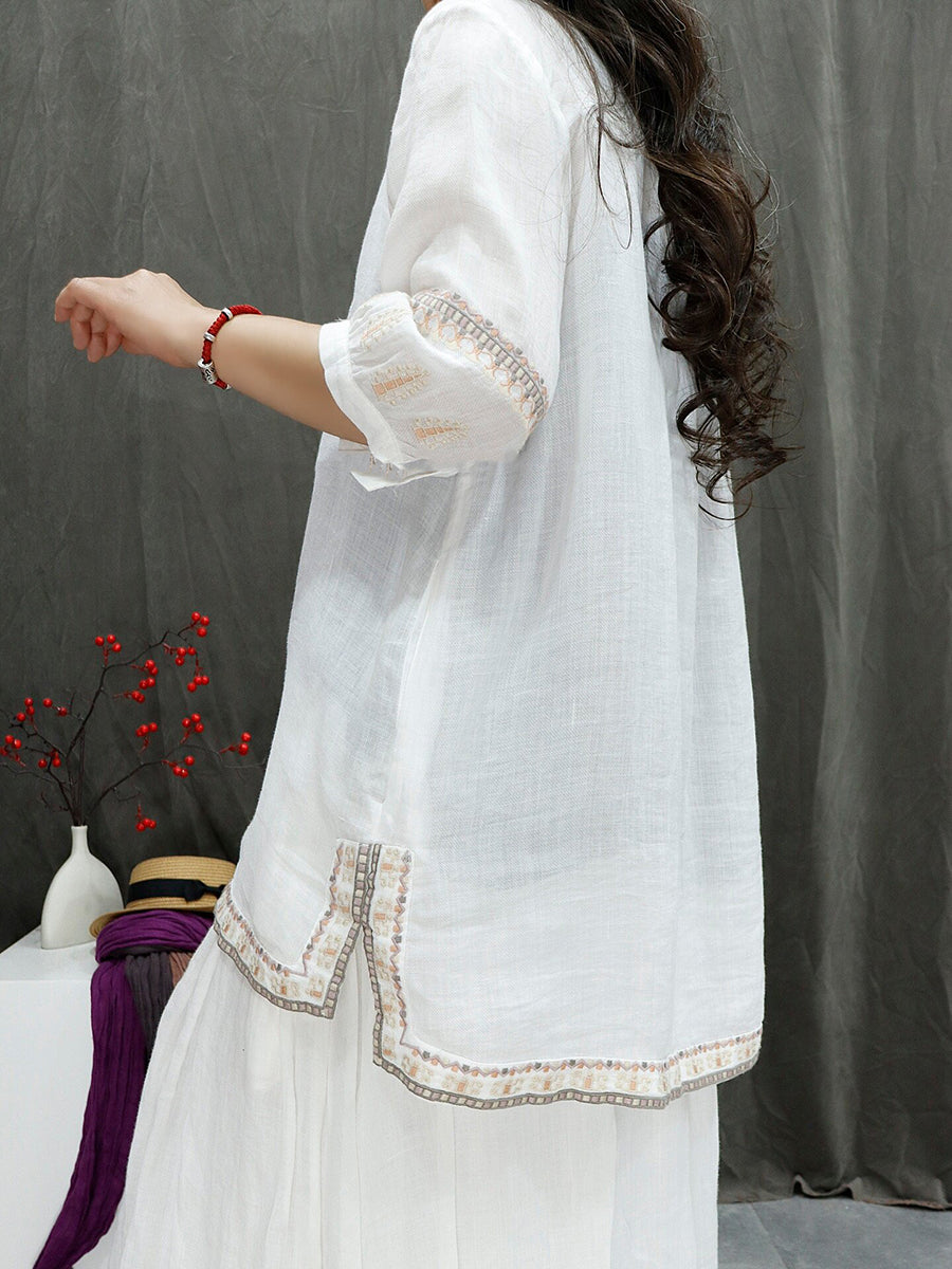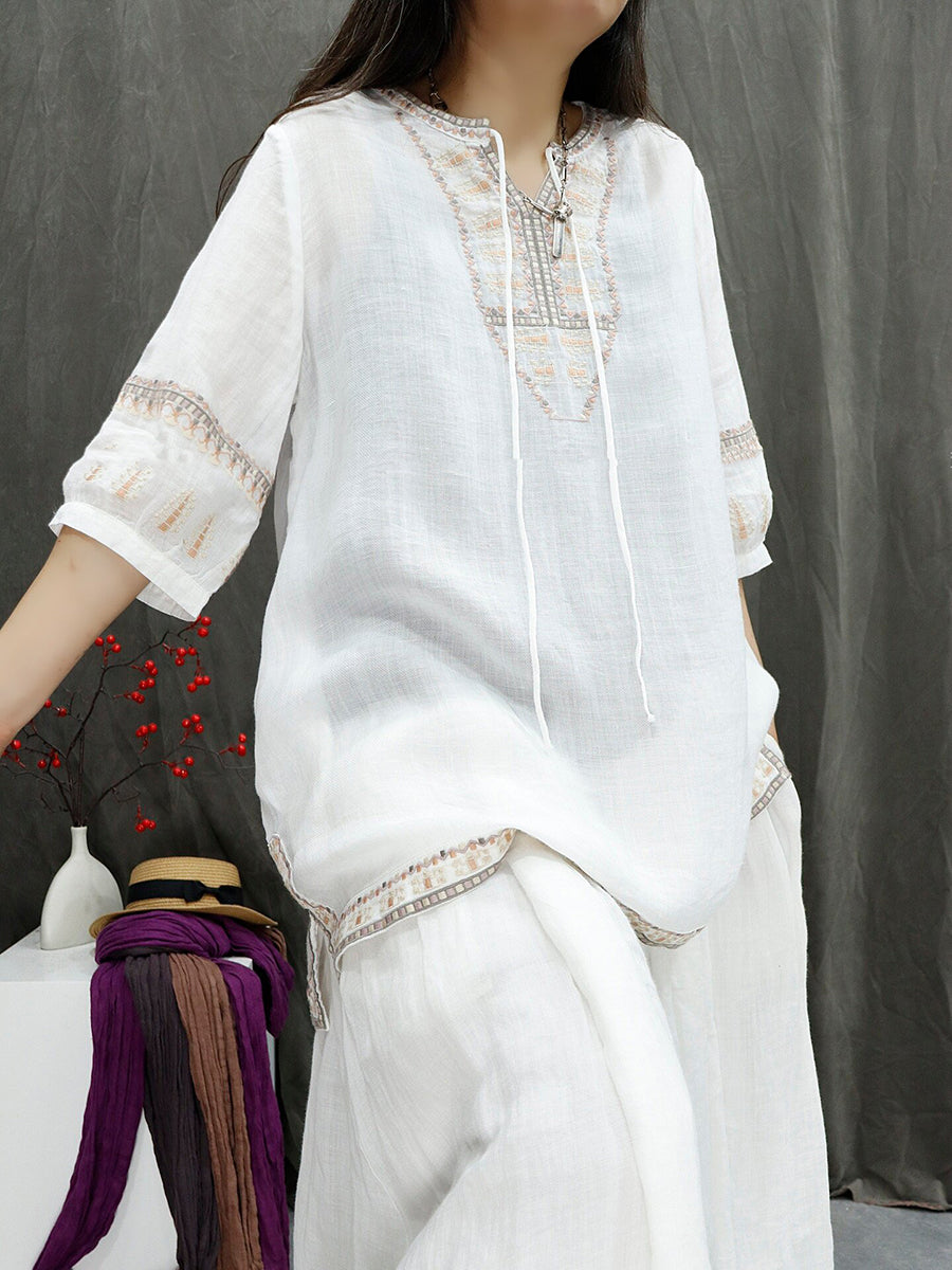 Women Summer Retro Embroidery 100%Ramie Blouse
