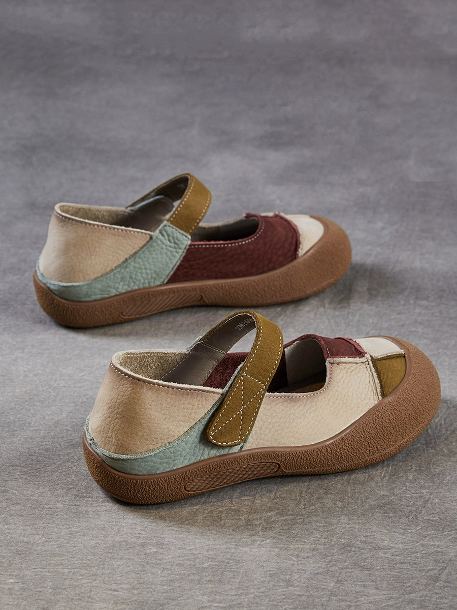 Women Summer Retro Genuine Leather Colorblock Shoes