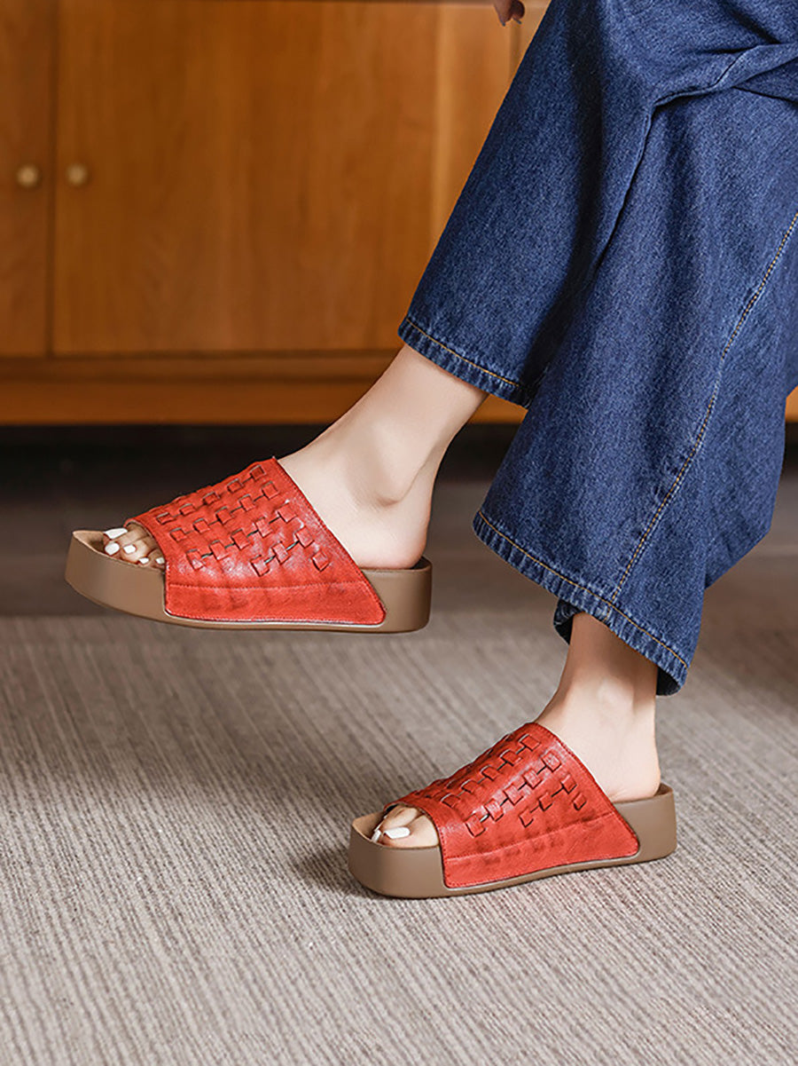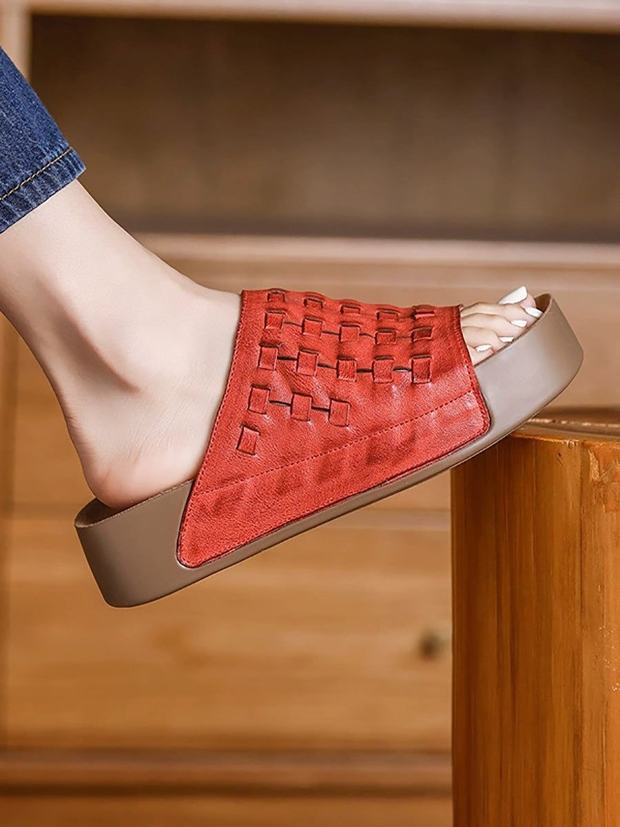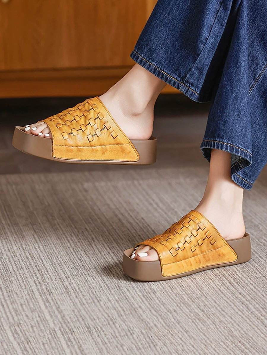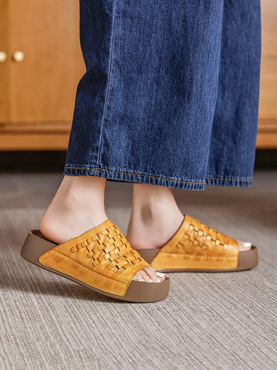 Women Summer Soft Genuine Leather Weave Slippers