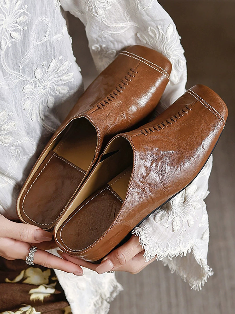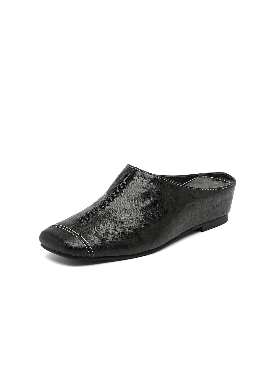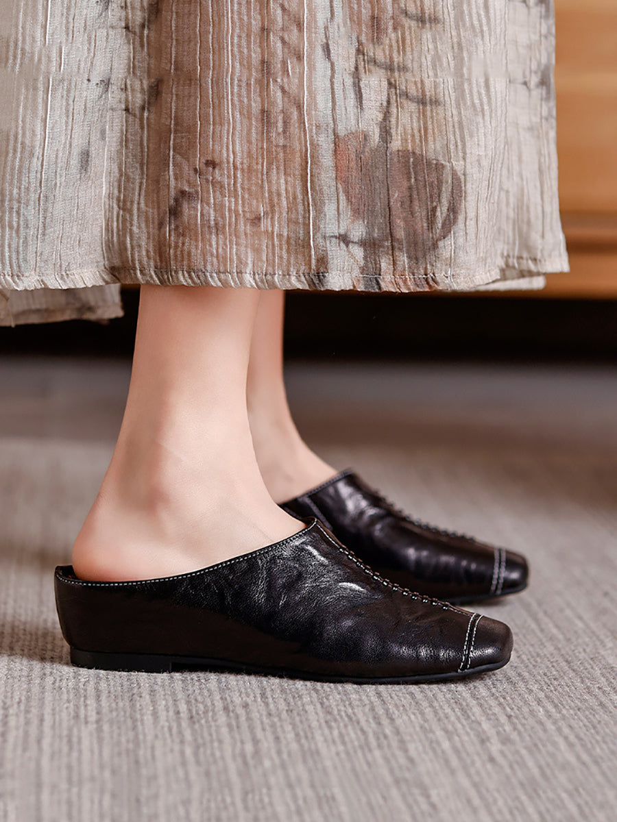 Women Summer Soft Leather Square Toe Slippers