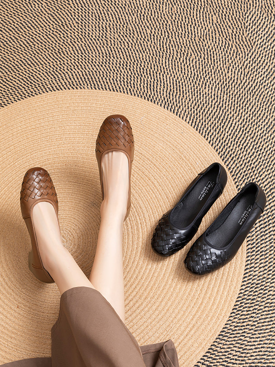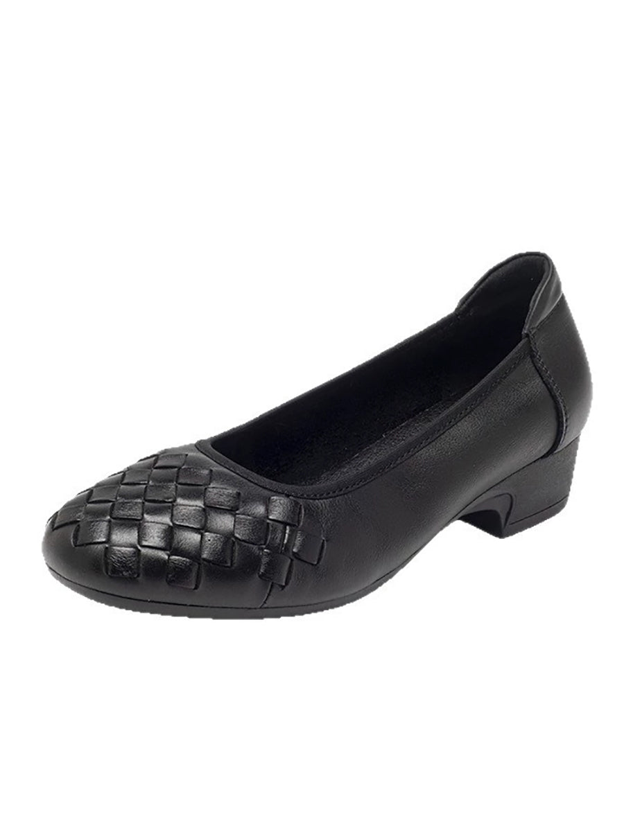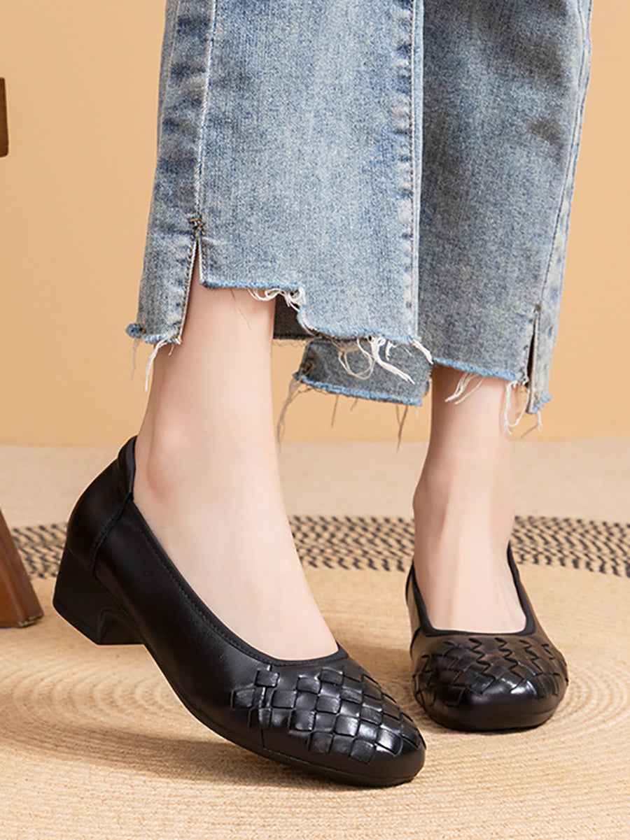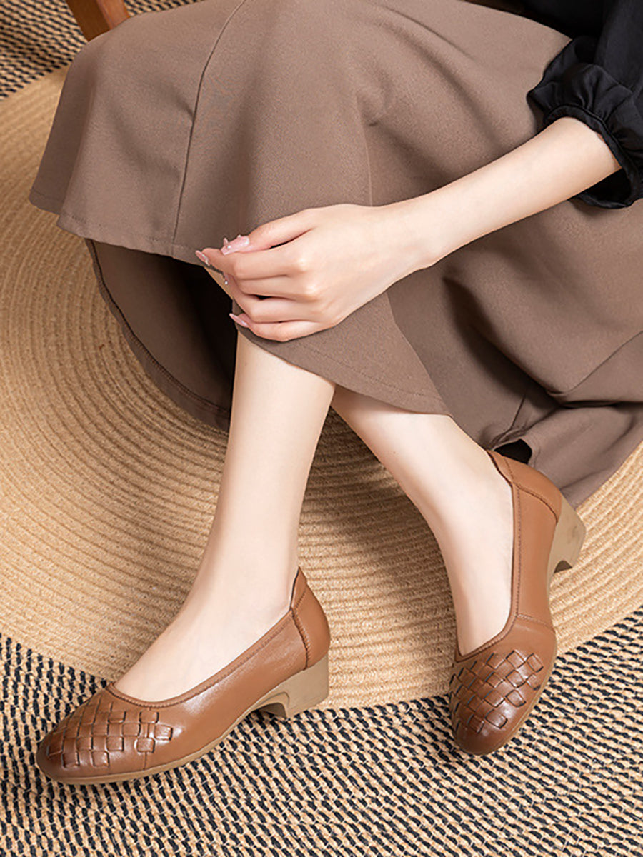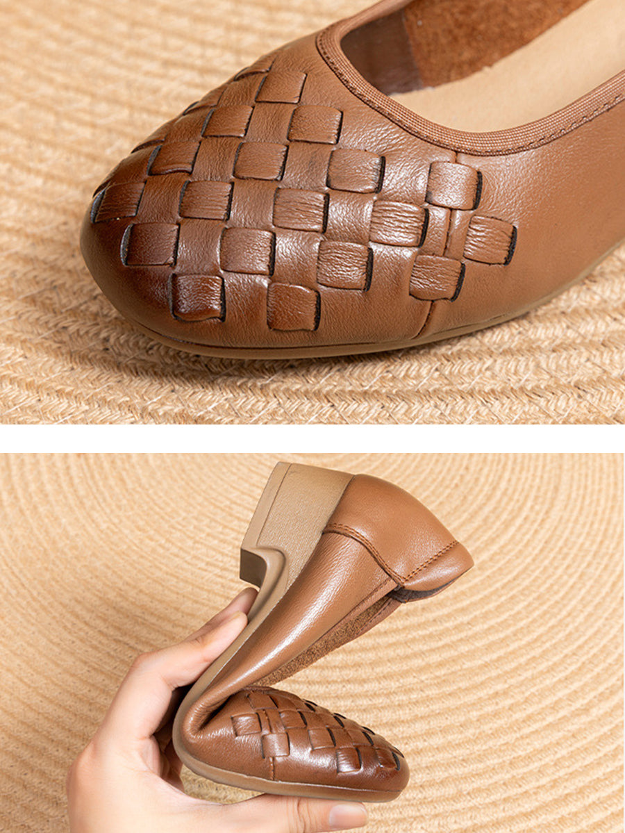 Women Summer Soft Leather Weave Mid Heel Shoes