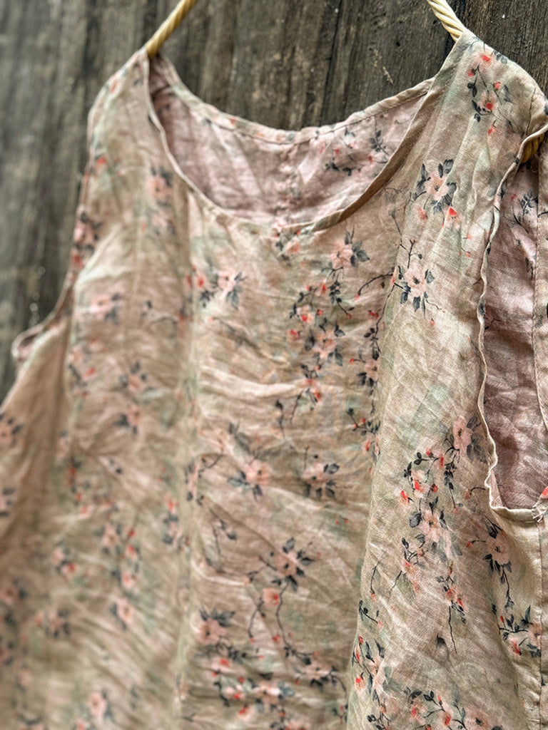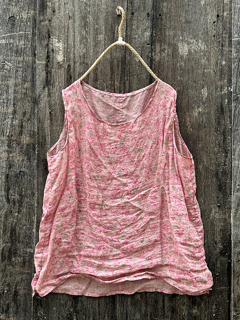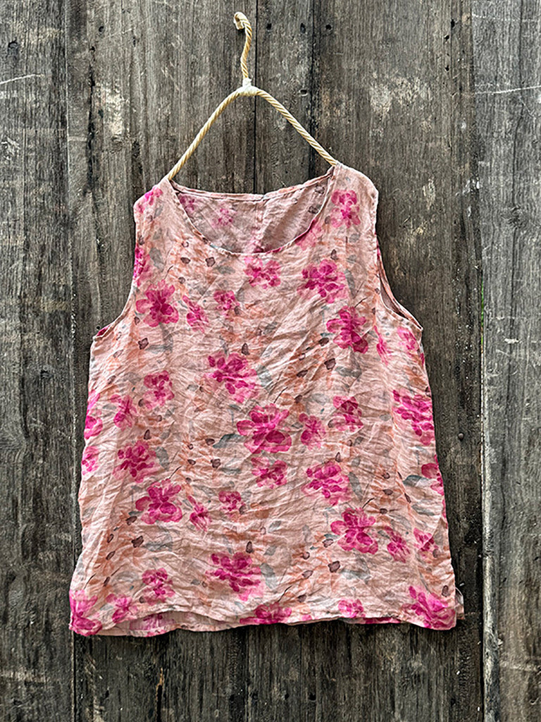 Women Summer Vintage Floral O-Neck Ramie Vest