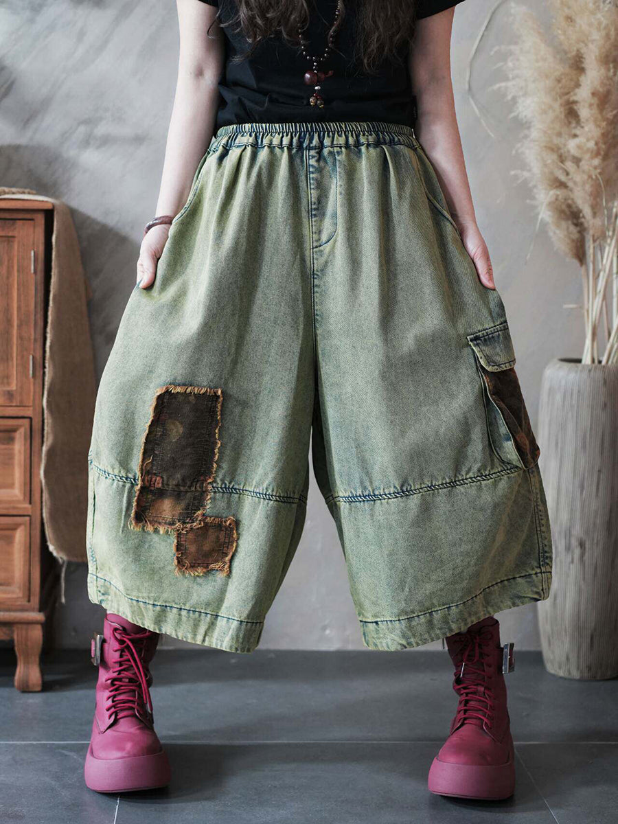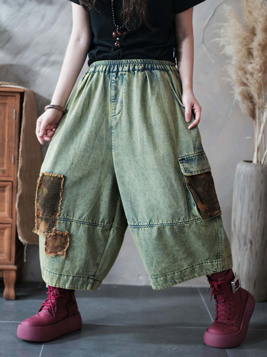 Women Summer Vintage Patchwork Denim Wide-leg Jeans