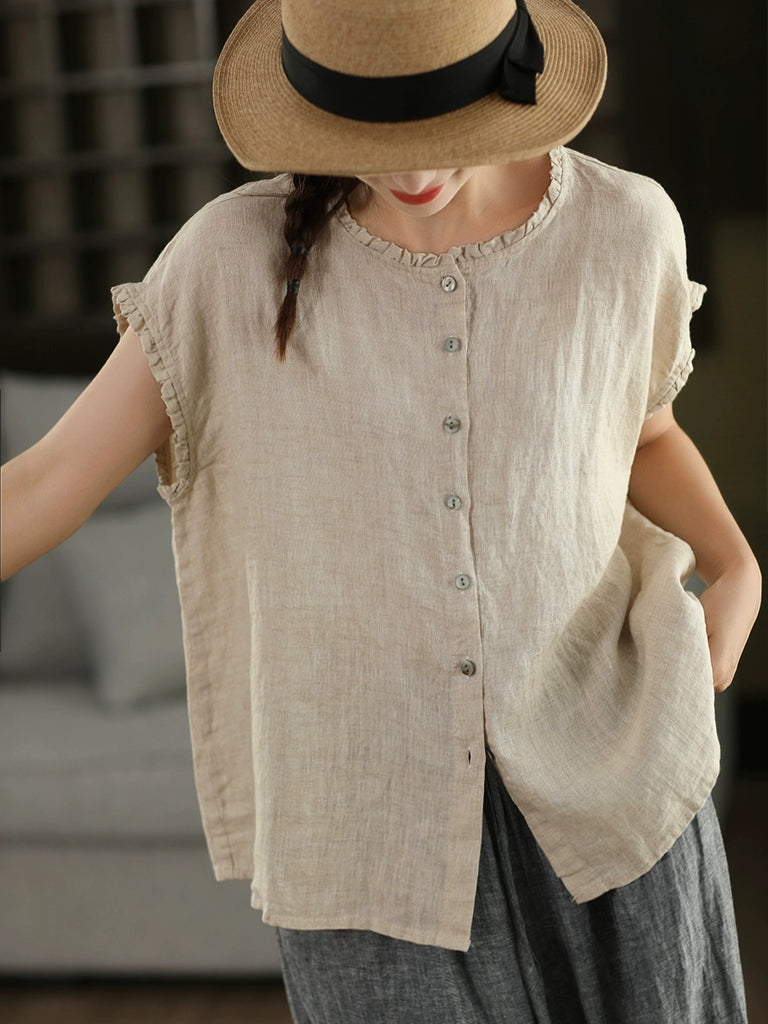 Women Summer Vintage Plaid 100%Linen O-Neck Shirt