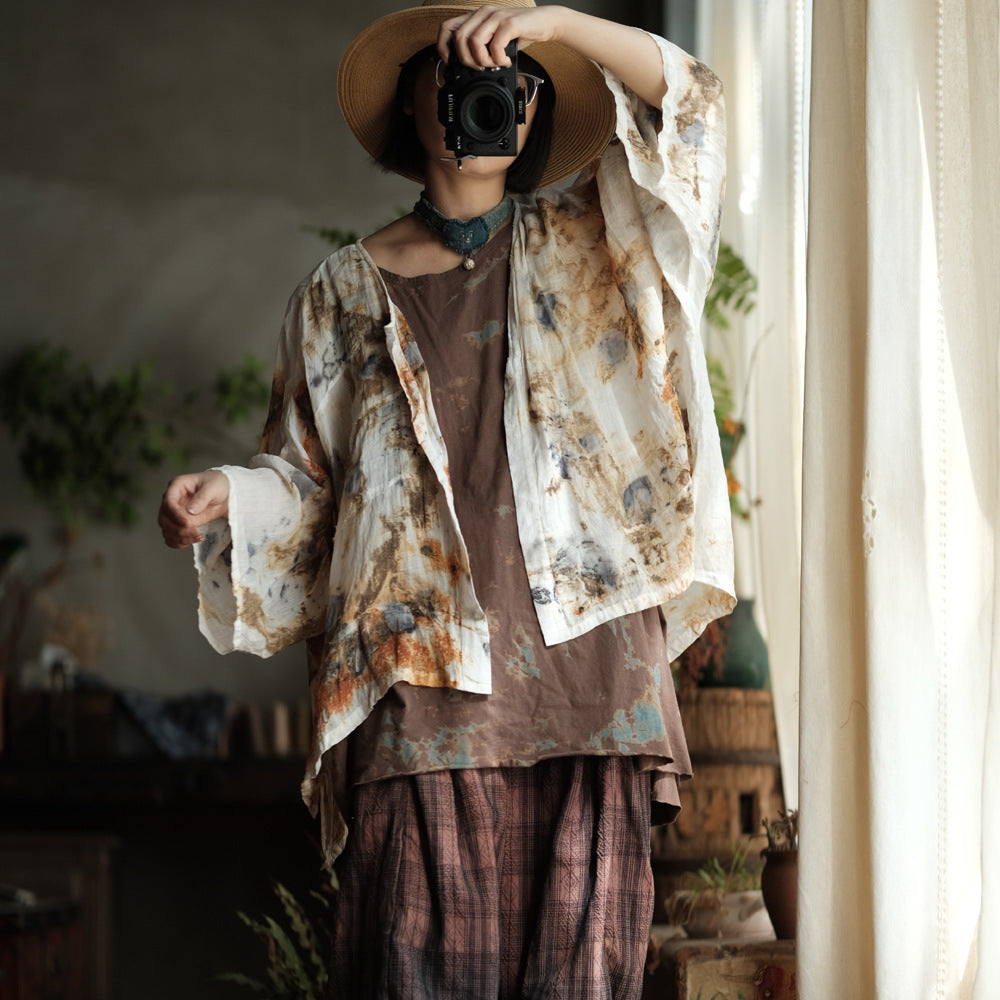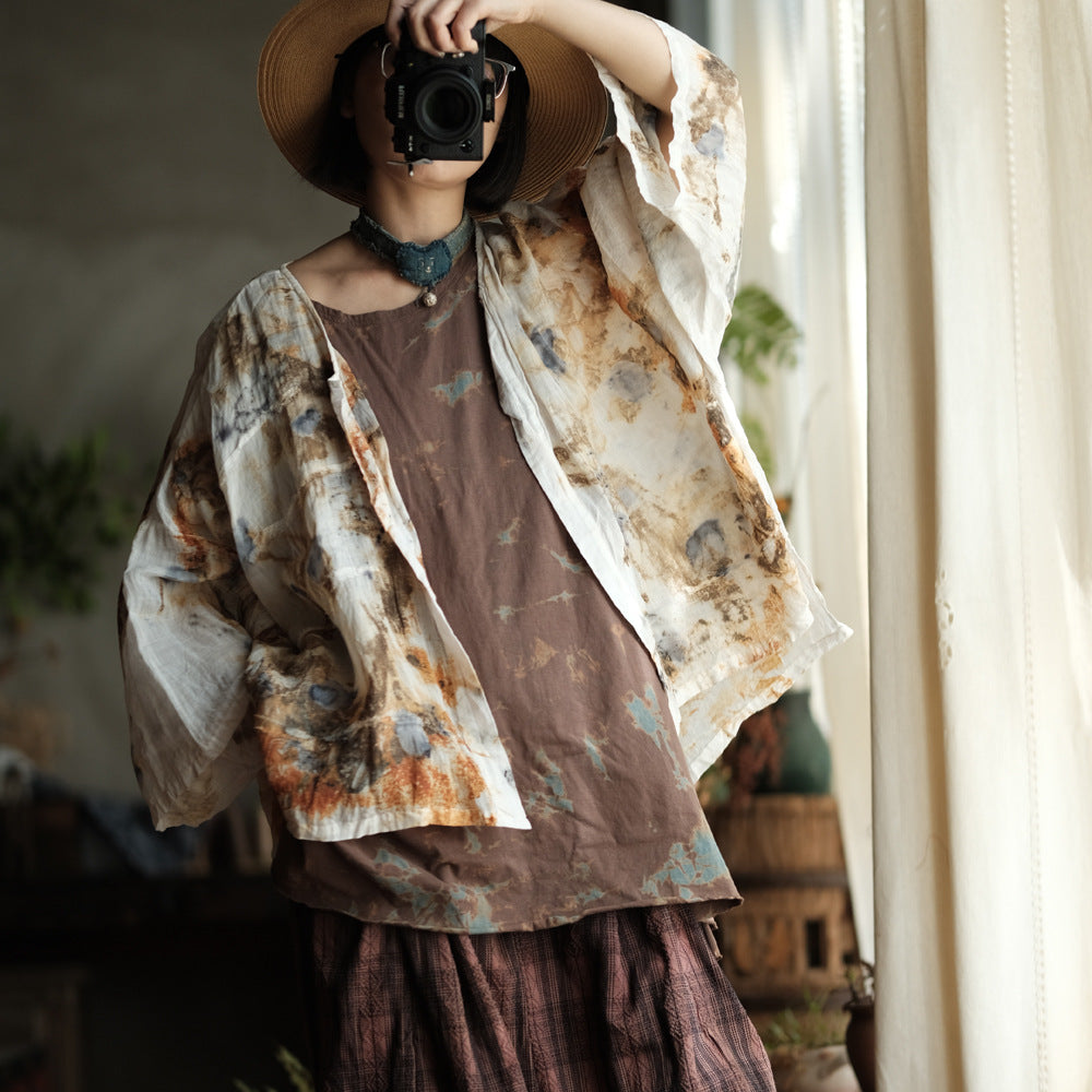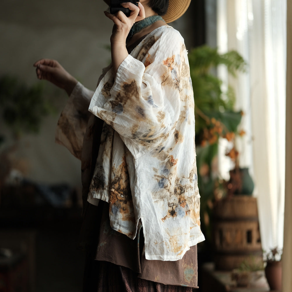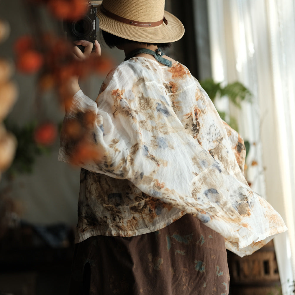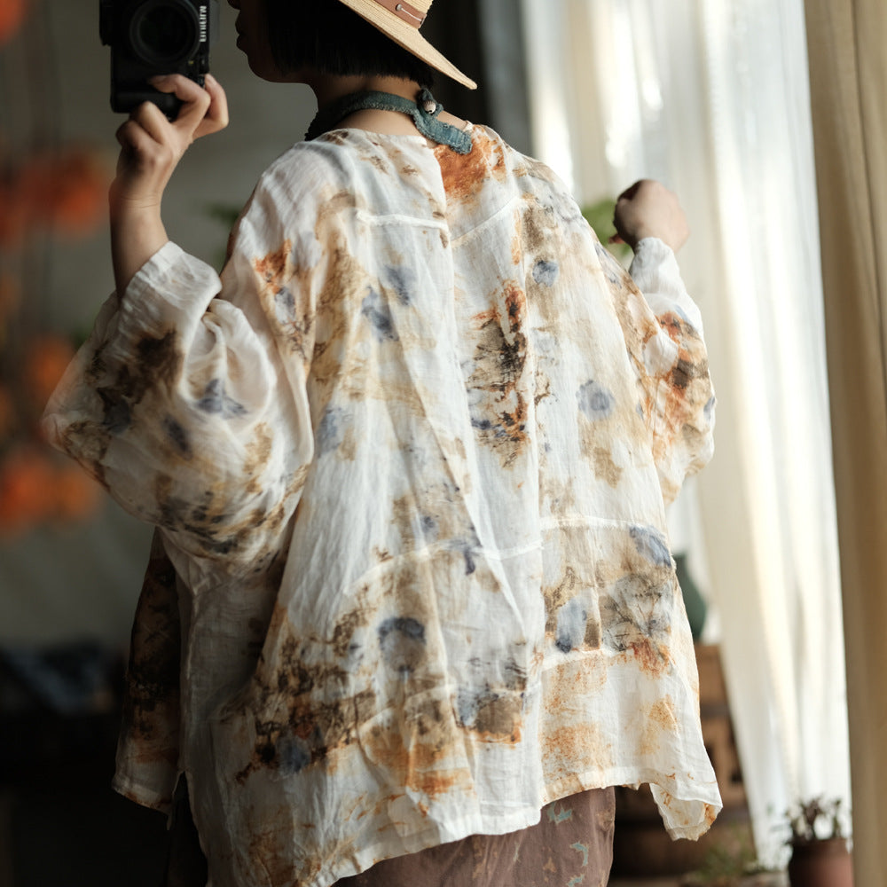 Women Summer Vintage Print O-Neck Thin Ramie Shirt