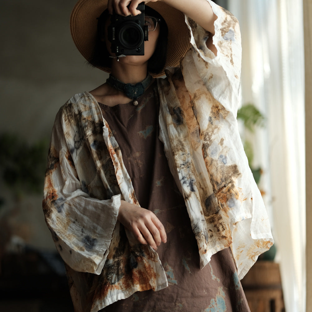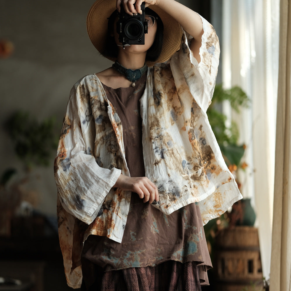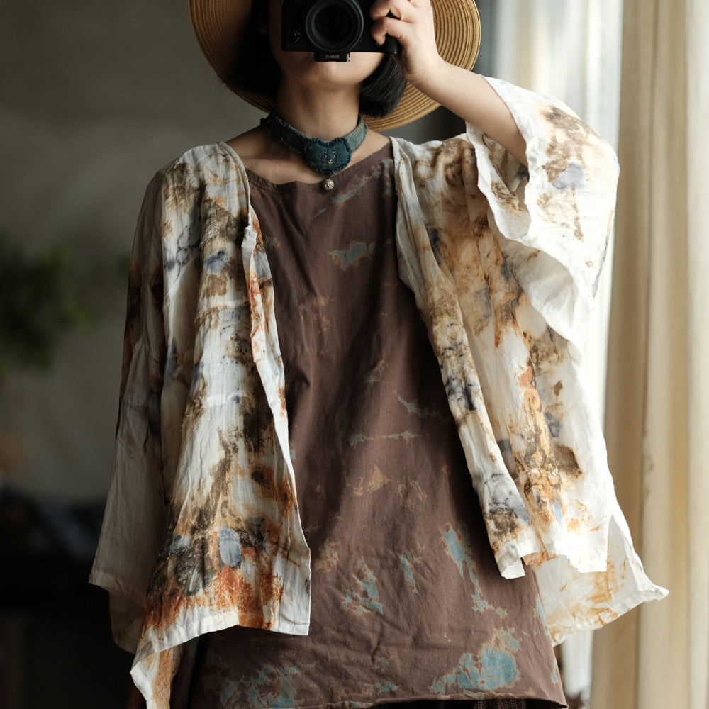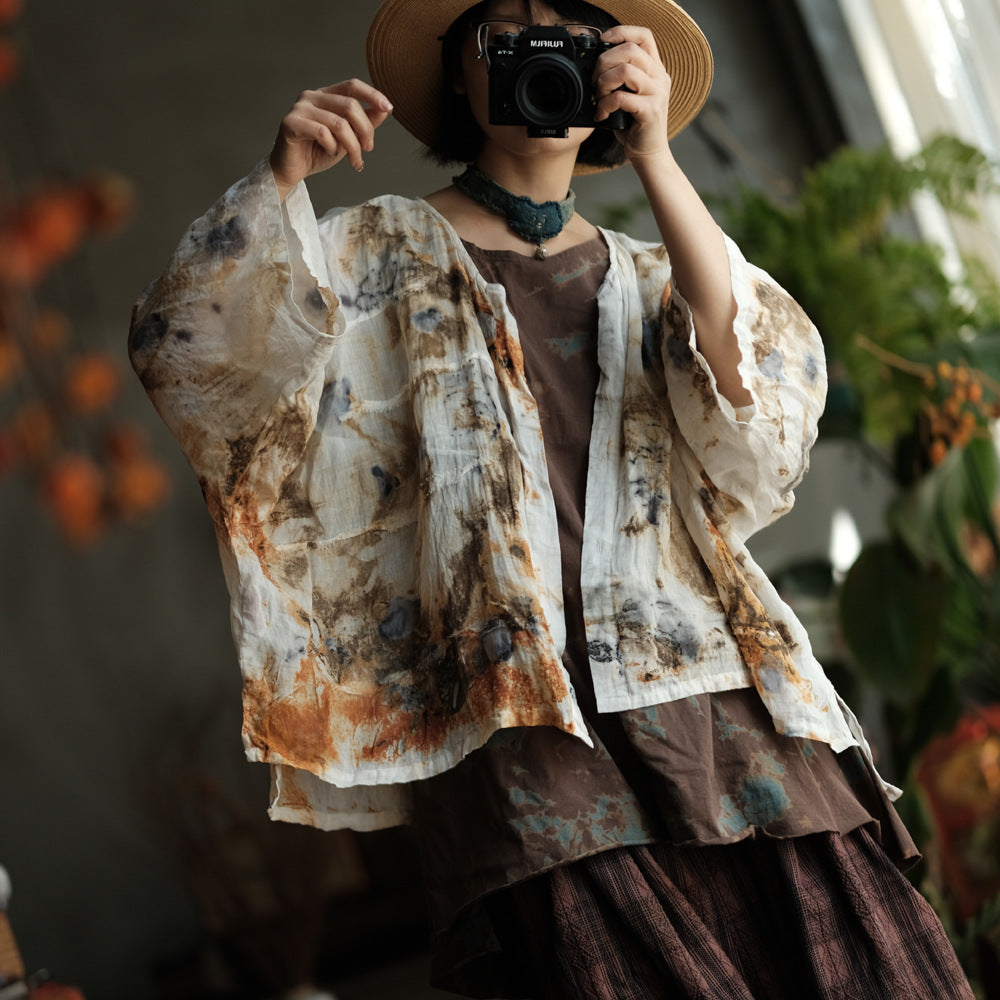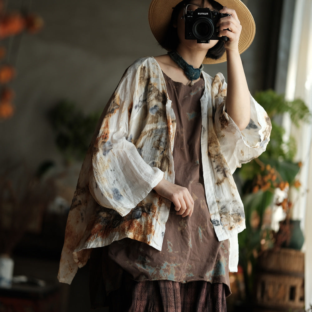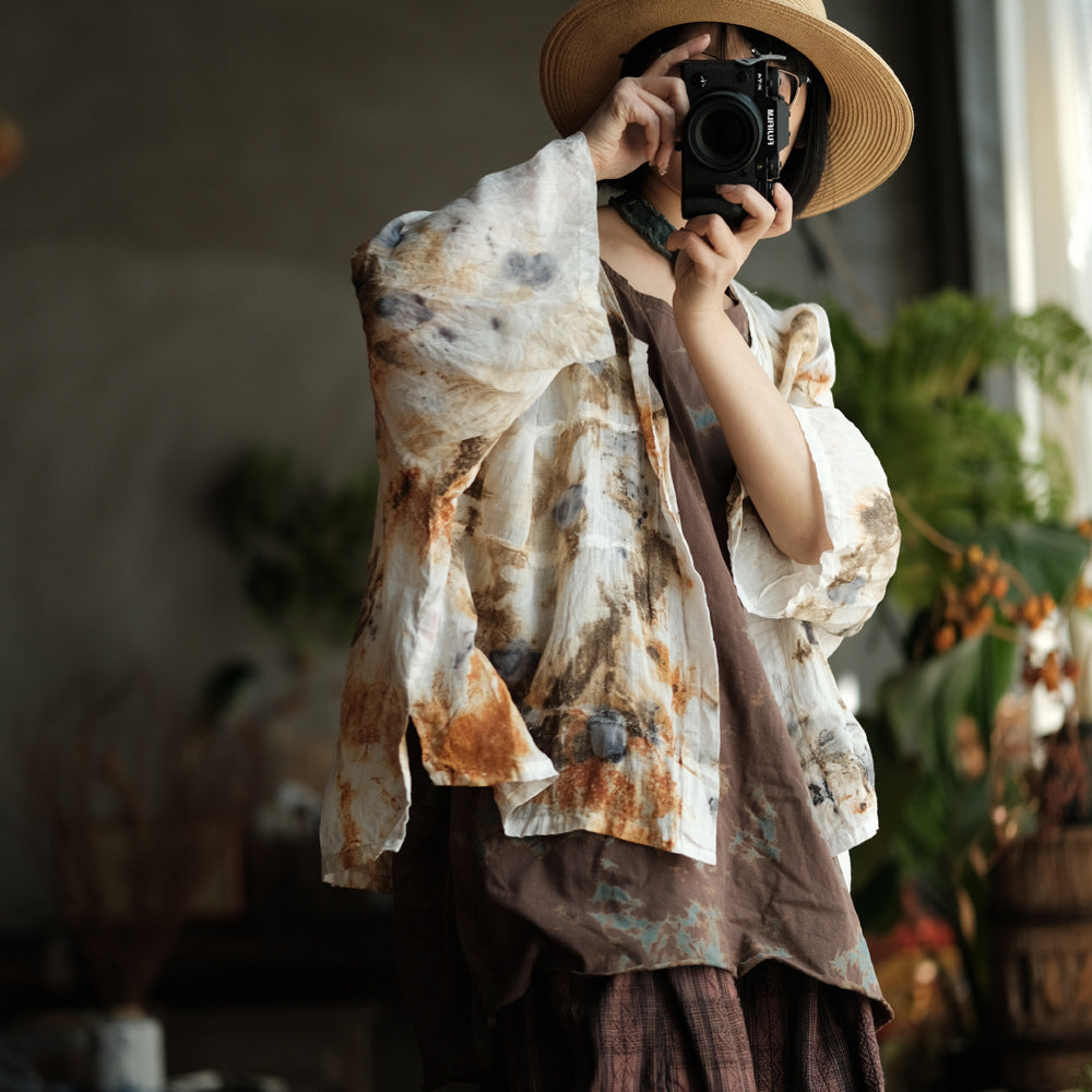 Women Summer Vintage Print O-Neck Thin Ramie Shirt