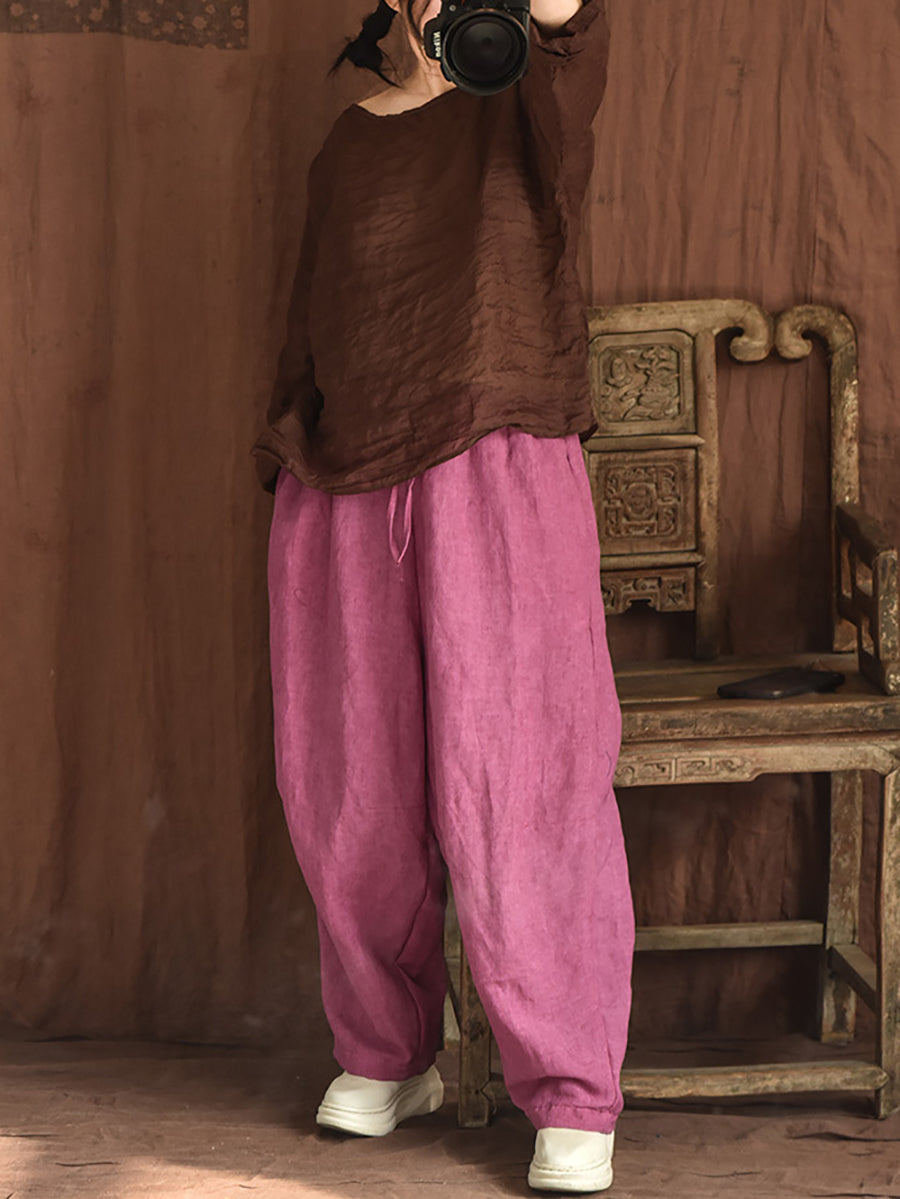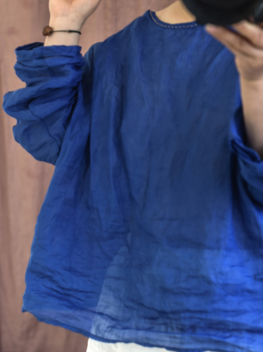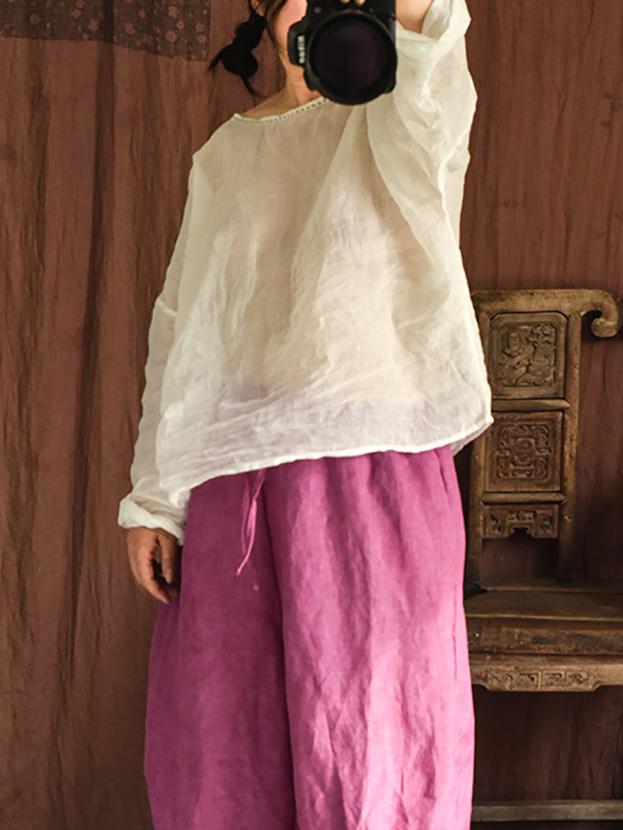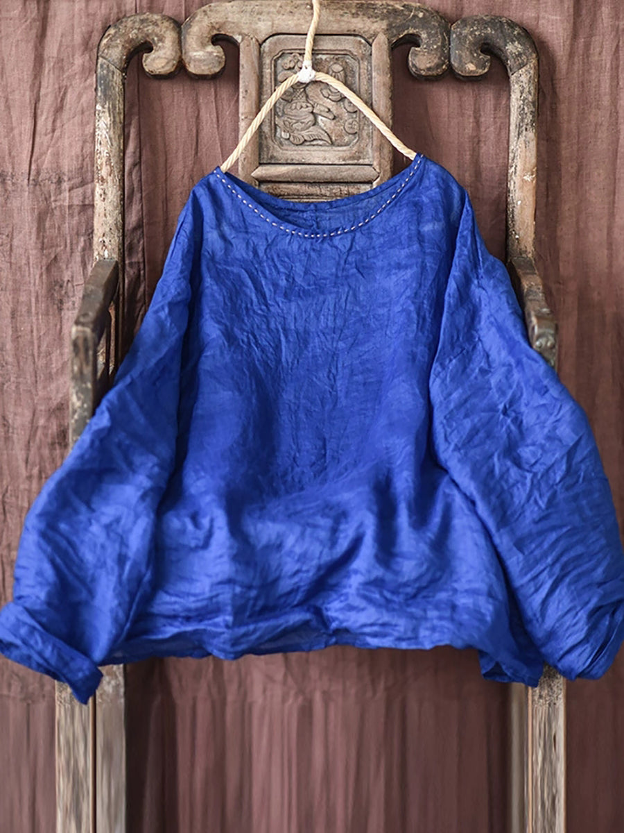 Women Summer Vintage Ramie O-Neck Blouse