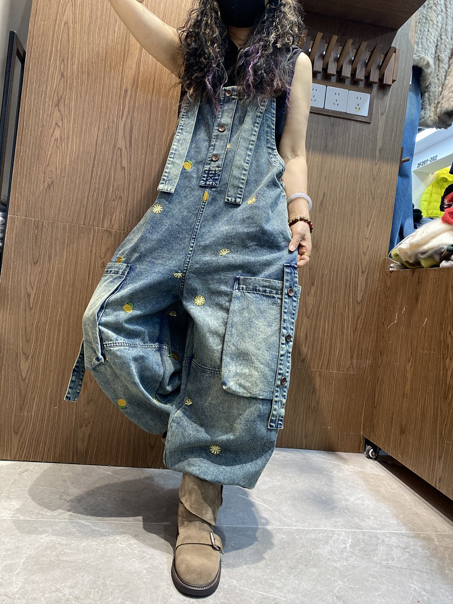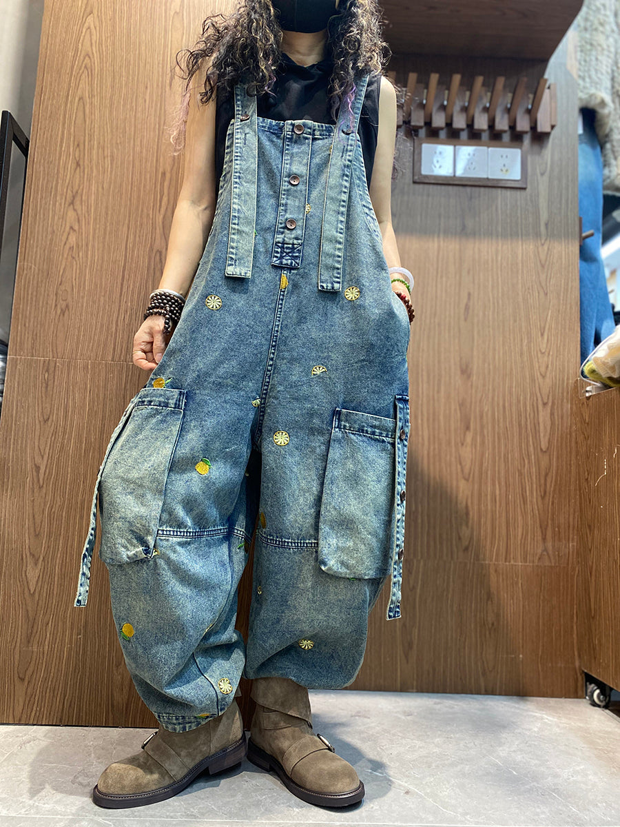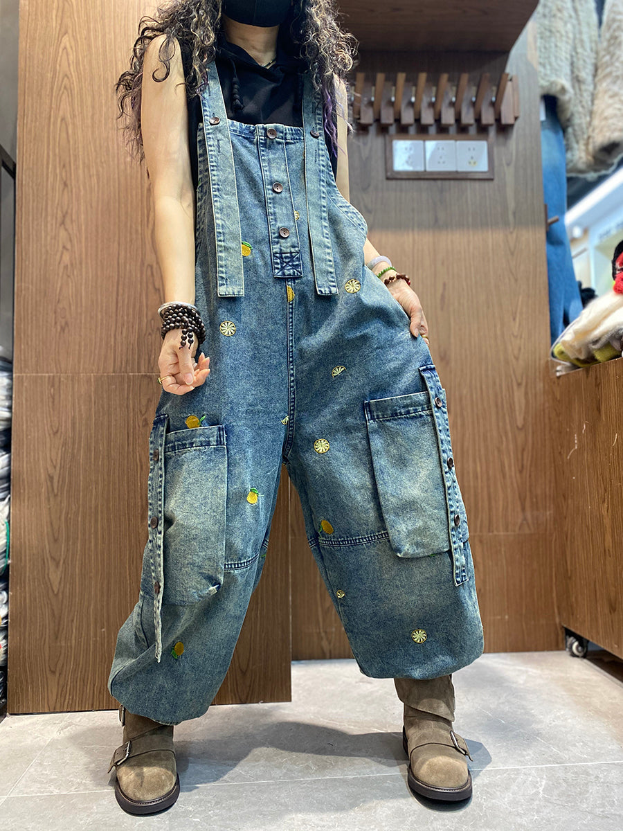 Women Vintage Embroidery Loose Denim Jumpsuits