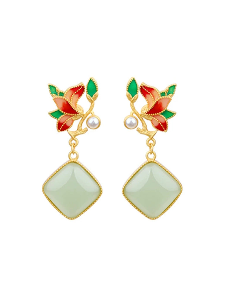 Women Vintage Flower Enamel S925Silver Jade Earrings
