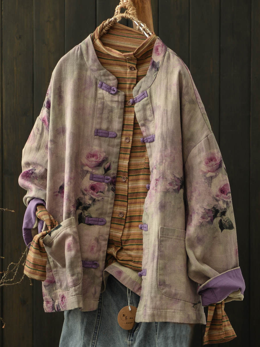 Women Winter Ethnic Flower Stand Collar Cotton Coat