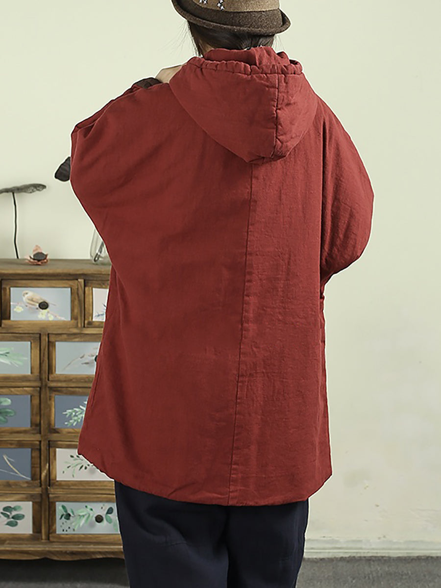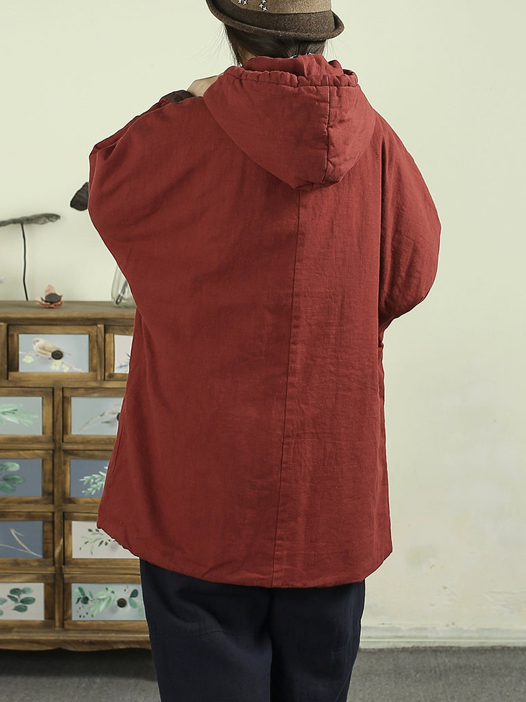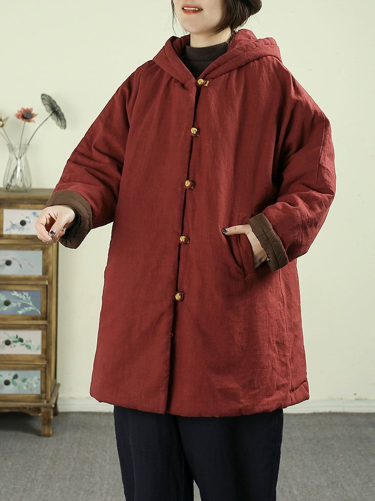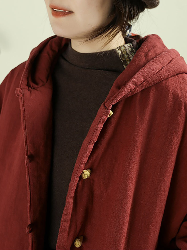 Women Winter Retro Pure Color 100%Linen Hooded Coat