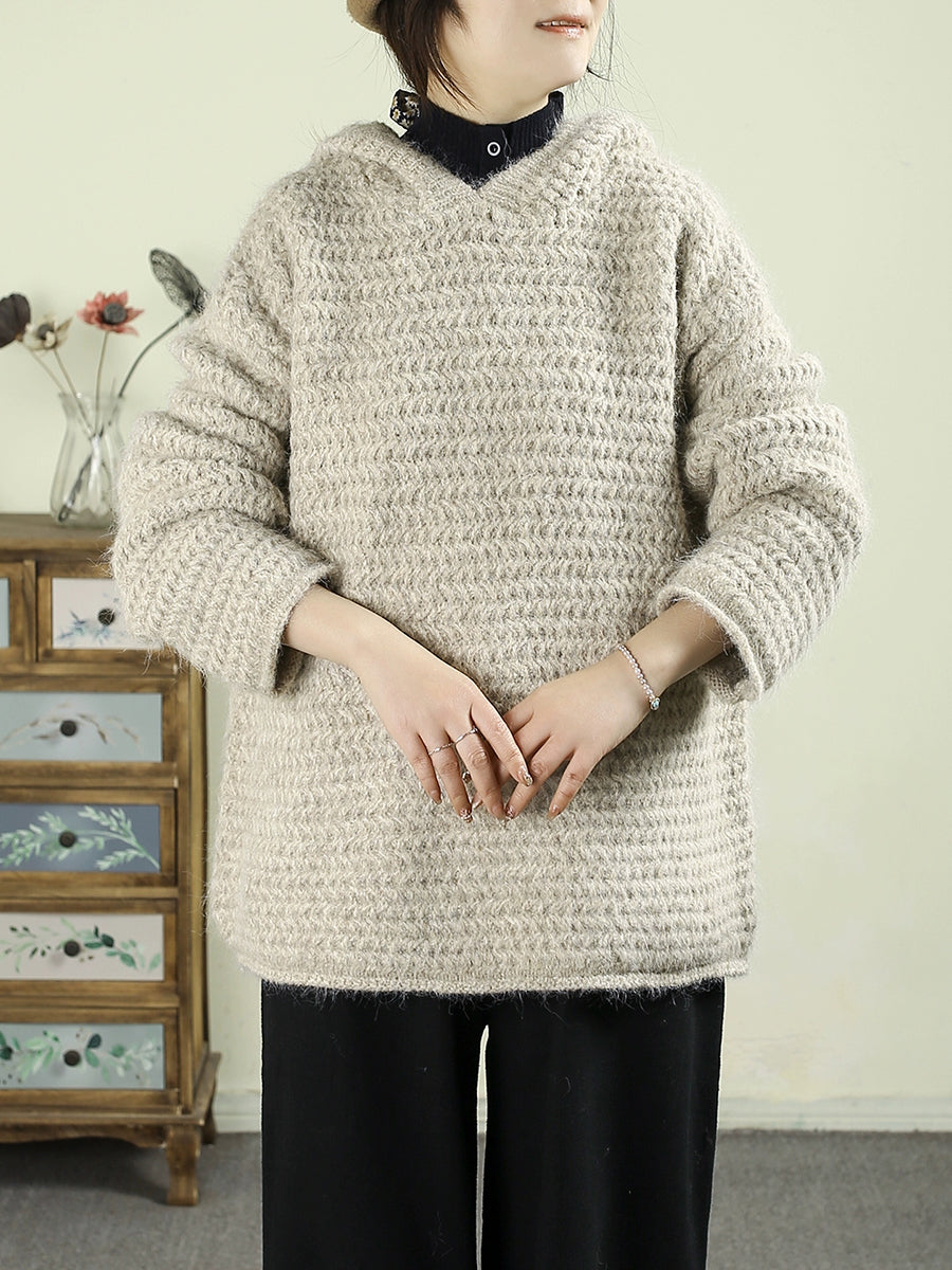 Women Winter Retro Pure Color Knitted Hooded Coat