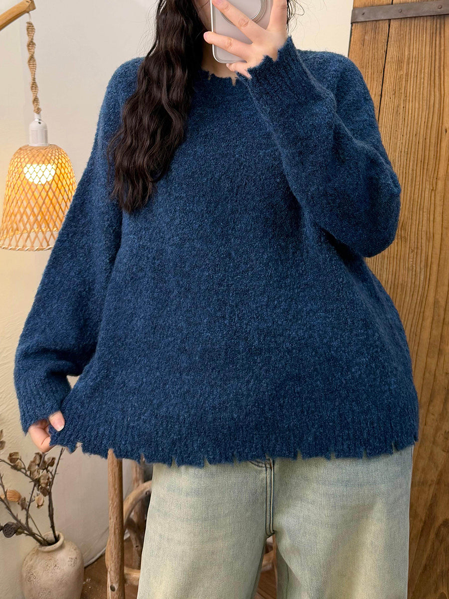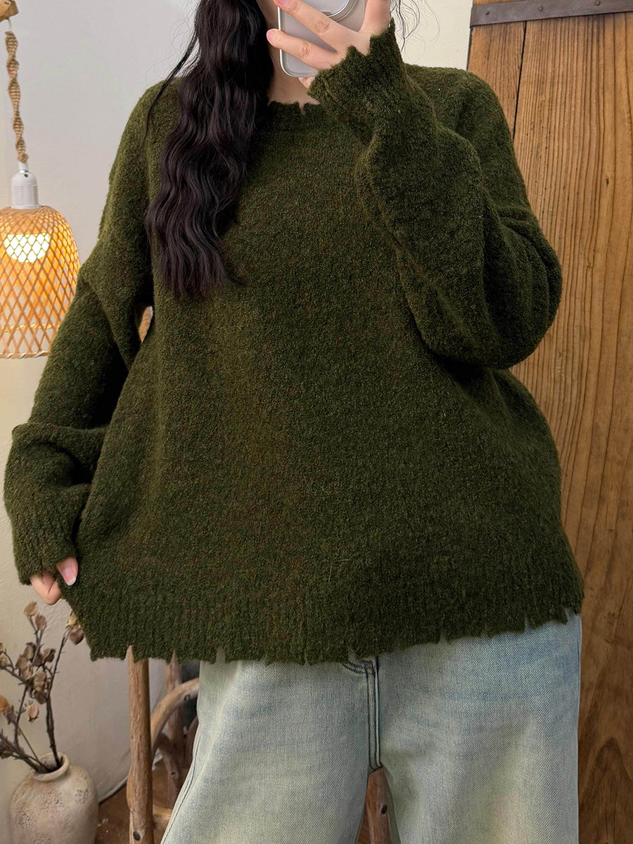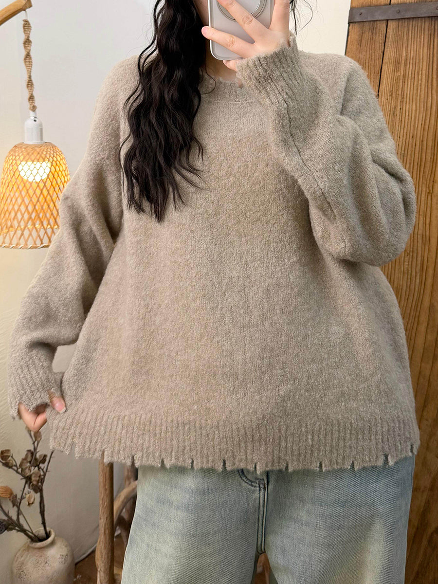 Women Winter Retro Pure Color O-Neck Sweater