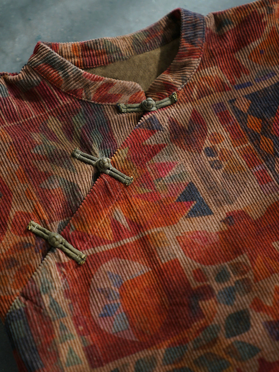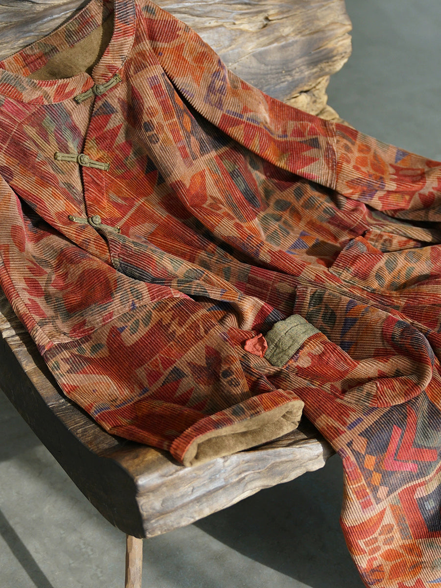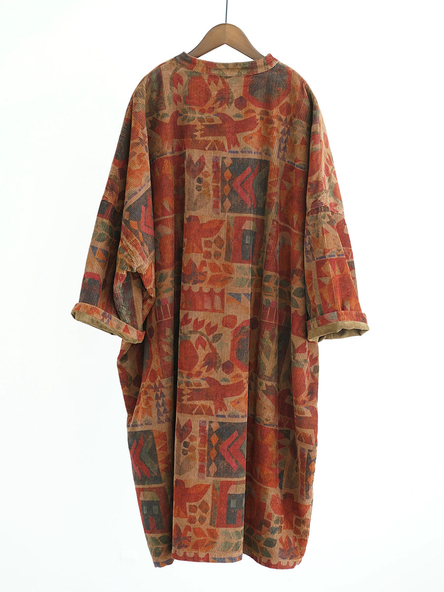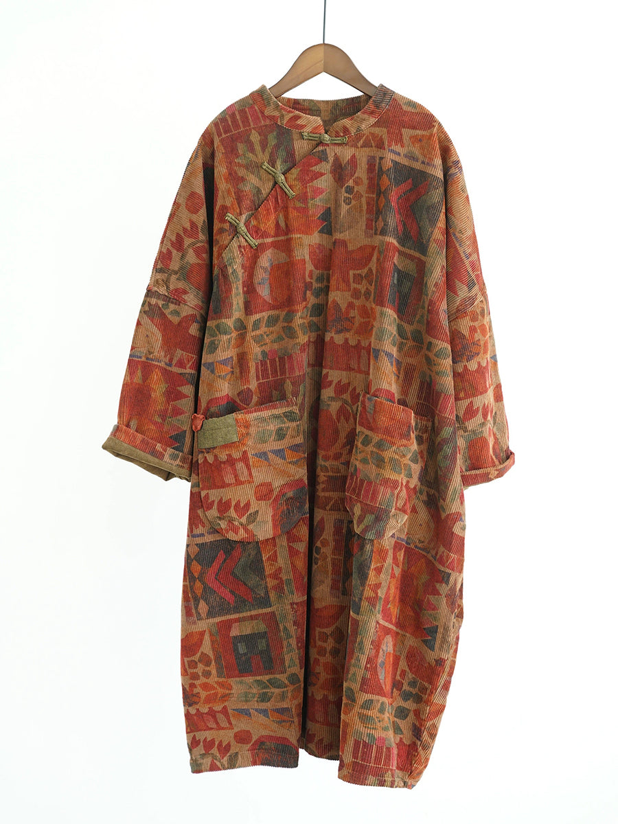 Women Winter Vintage Geometric Stand Collar 100%Cotton Robe Dress